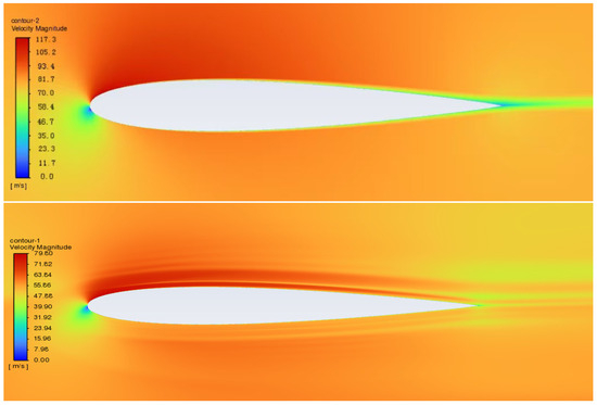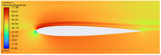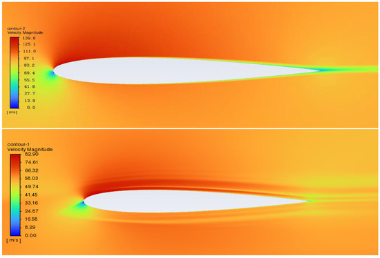 Taking a sand–dust concentration of 0.0769 kg/m3 as an example, numerical simulations of the velocity distribution in the flow field around the airfoil were conducted at fixed angles of attack of 3°, 8°, and 12°, while varying the incoming flow velocity. The results are shown as Figure 12, Figure 13 and Figure 14 follows: