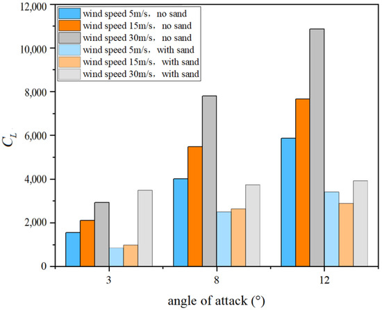 Sand and dust concentration has a pronounced effect on the lift characteristics of the airfoil, with higher concentrations leading to more severe lift reduction. Across all tested wind speeds and angles of attack, lift consistently decreases as particle concentration increases. For example, at an angle of attack of 12° and a wind speed of 30 m/s, the lift drops from 4302 at a concentration of 0.0319 kg/m3 to 3919 at 0.0769 kg/m3, and further down to 3484 at 0.0891 kg/m3, representing a cumulative decrease of nearly 20%. Similar trends are observed under other combinations of angle of attack and wind speed. The monotonic decline in lift with increasing concentration indicates that higher particle loading intensifies momentum exchange within the boundary layer and increases surface roughness, thereby inducing earlier flow separation and substantially weakening suction over the upper surface. This effect is particularly pronounced at high angles of attack, where the boundary layer is inherently more fragile and particle-induced disturbances more readily trigger stall.