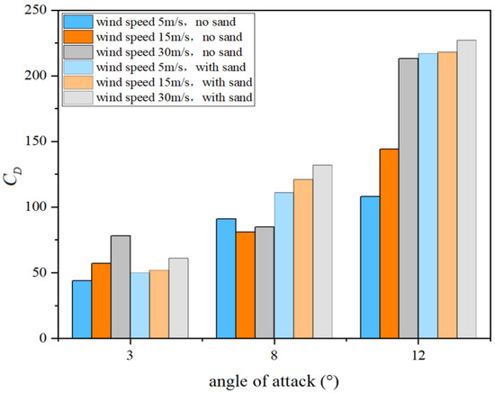 The above data were organized to show the percentage change in aerodynamic coefficients caused by dust under different angles of attack at the same wind speed, as shown in Table 1, Table 2 and Table 3 below: