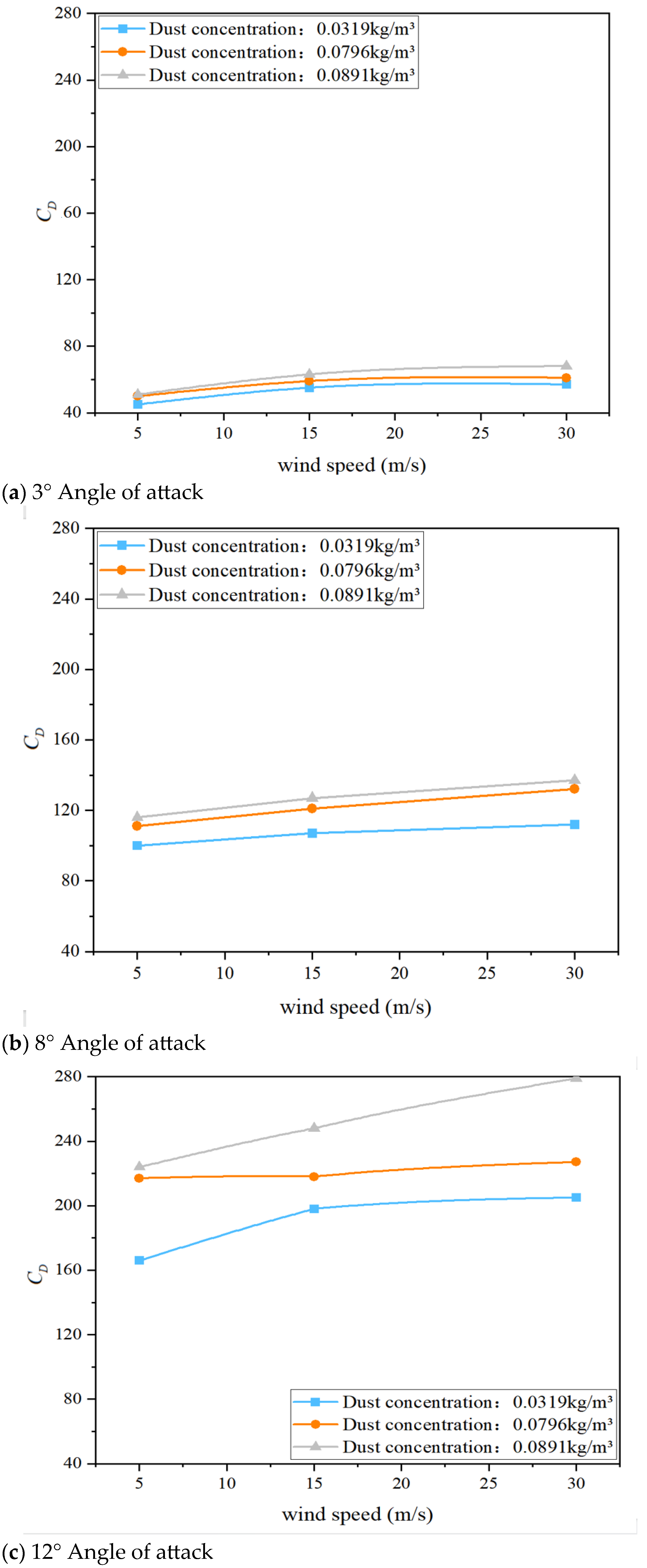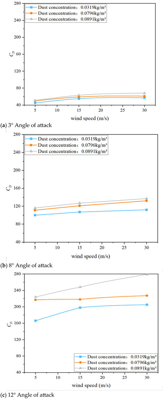 Under varying concentration conditions, drag exhibits a positive correlation with dust concentration—higher concentrations produce greater drag. For example, at an angle of attack of 8° and a wind speed of 30 m/s, drag increases from 112 at a concentration of 0.0319 kg/m3 to 132 at 0.0769 kg/m3, and further to 137 at 0.0891 kg/m3, representing an increase of more than 20%. This trend indicates that increasing dust concentration not only intensifies flow-field disturbances and shear-layer separation, but also introduces additional drag sources through the direct drag effect of the particles themselves, thereby amplifying the overall drag coefficient.
