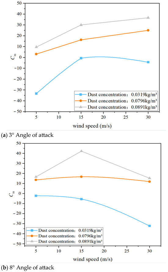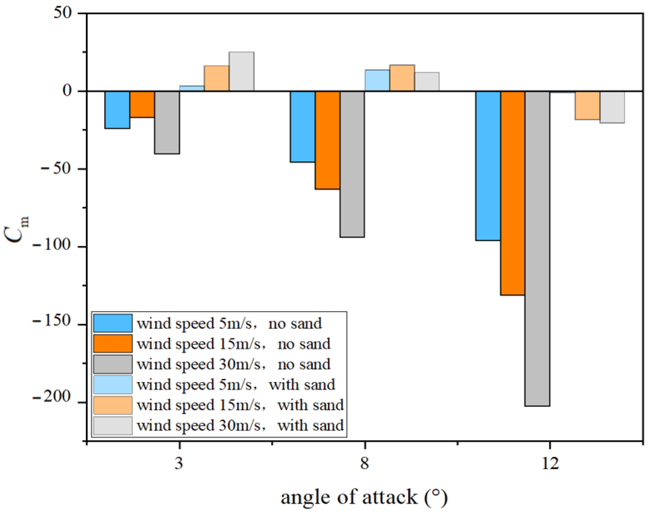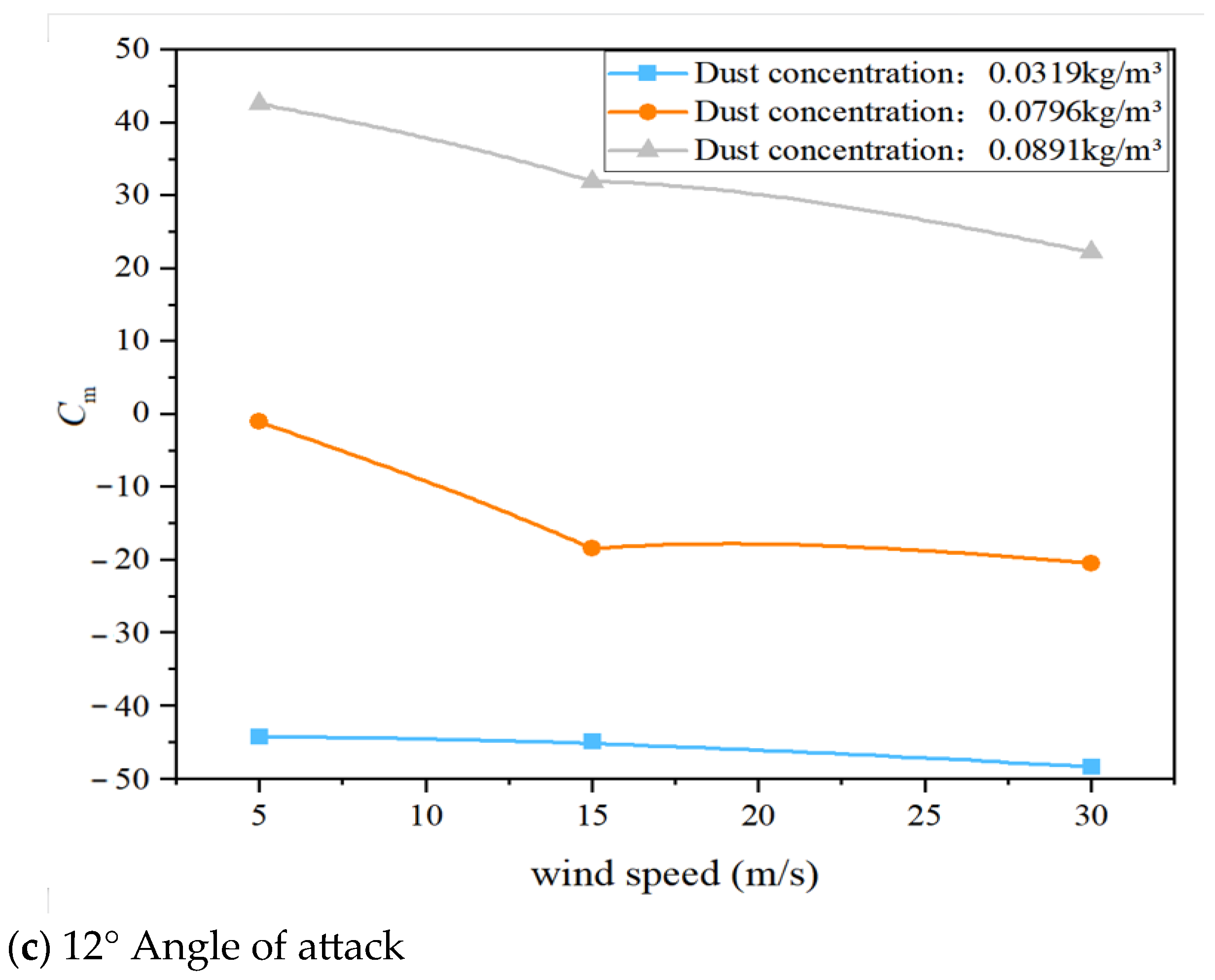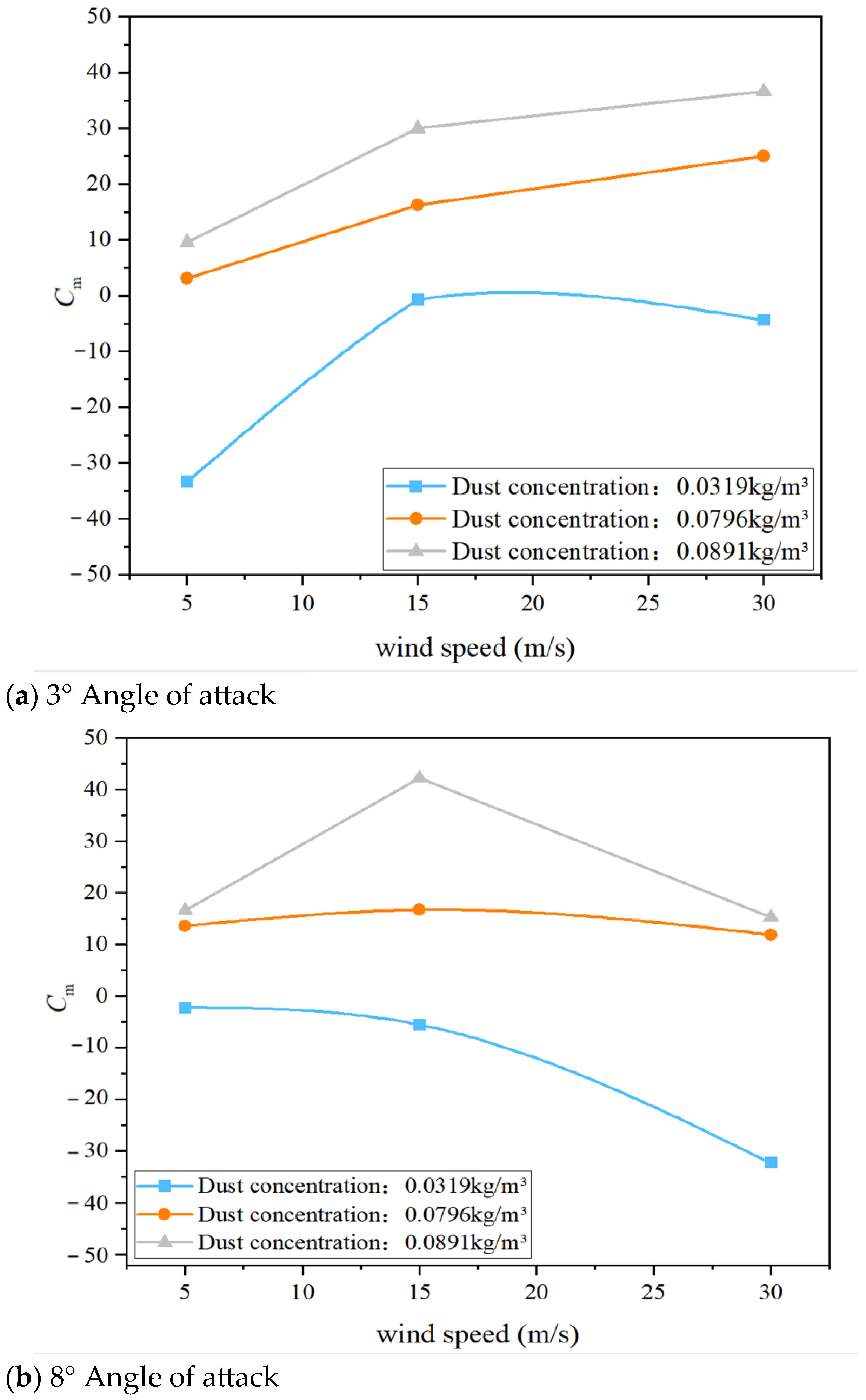The pitching moment coefficient is highly sensitive to variations in sand and dust concentration, particularly at angles of attack of 3° and 8°. Changes are observed not only in the magnitude of the moment, which increases substantially, but also in its direction, with reversals occurring under certain operating conditions. For example, at a wind speed of 5 m/s and an angle of attack of 8°, the pitching moment shifts from −33. 4 at a concentration of 0.0319 kg/m3 to 13. 6 at 0.0769 kg/m3, and further rises to 42. 4 at 0.0891 kg/m3. This represents not only a multiple-fold increase in magnitude, but also a clear reversal from nose-down to nose-up moment, indicating a forward shift of the aerodynamic center and an enhancement of nose-up pitching tendency.