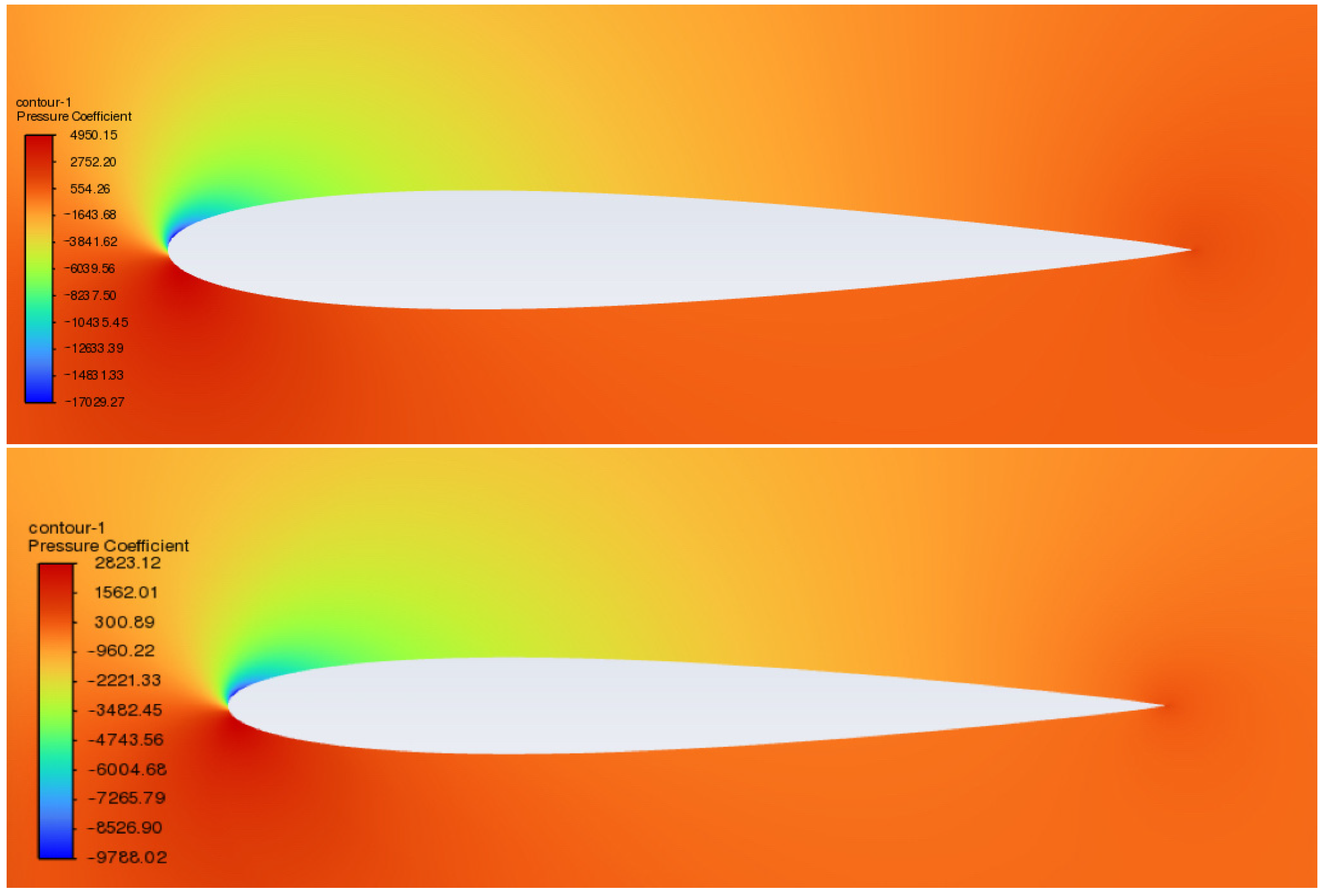 From the above contour plots, it can be seen that, during the aircraft’s takeoff preparation phase, airborne sand–dust particles cause noticeable changes in the surrounding flow velocity. In clean air, the flow over the suction surface accelerates smoothly, reaching a high velocity near the leading edge, and then gradually recovers toward the trailing edge. However, in a dusty environment, a distinct velocity stratification appears on the upper surface near the leading edge. This stratification indicates the formation of multiple velocity layers, which can be attributed to momentum exchange between the carrier fluid and the suspended dust particles. From a physical standpoint, the introduction of dust, acting as discrete phase particles, alters the boundary-layer dynamics through drag and inertial interactions with the flow. Due to their mass, the particles lag behind the rapidly moving airstream, causing momentum deficit in the near-wall region while the outer boundary layer maintains relatively higher velocity. This effect creates a velocity gradient—or “layering”—within the boundary layer, visible as stratified structures in the velocity contours. Additionally, the presence of particles increases local turbulence intensity and promotes earlier transition or thickening of the boundary layer, further intensifying the stratification effect.