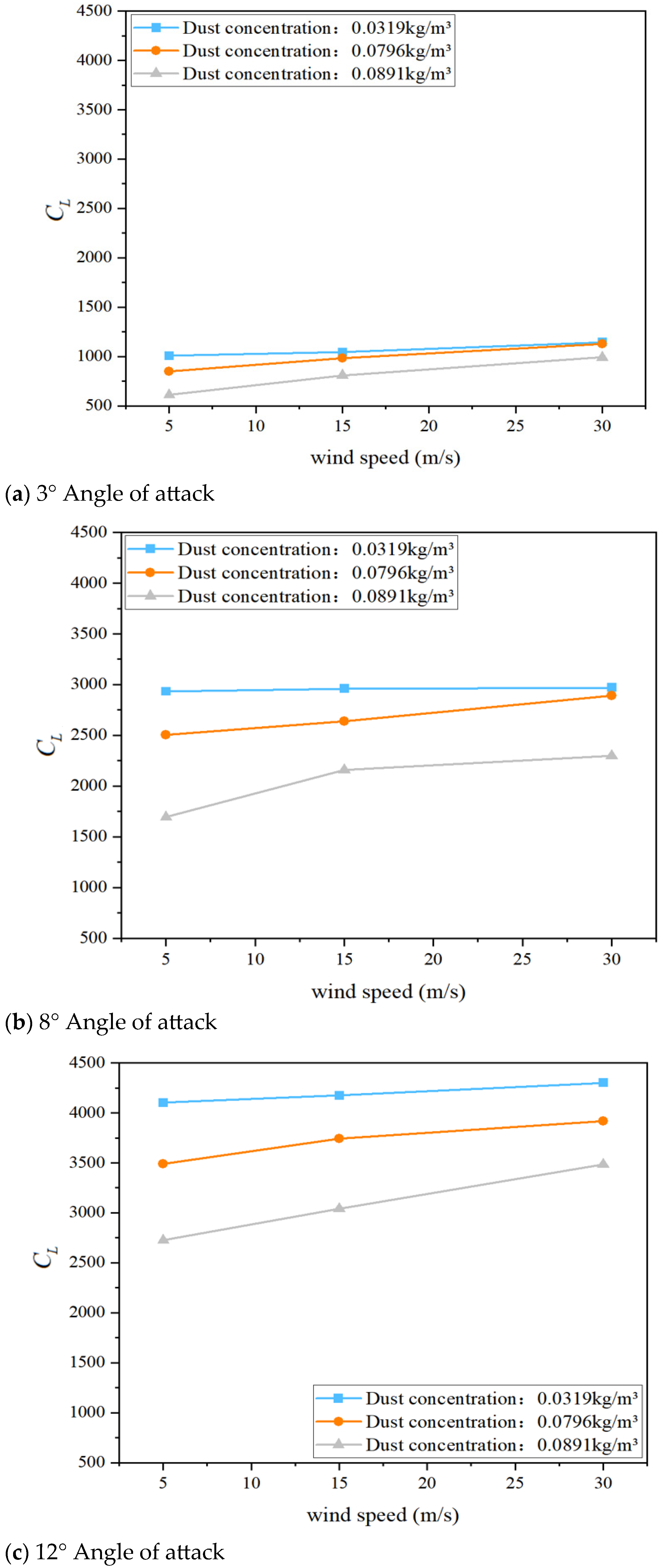For each combination of wind speed and angle of attack, simulations were performed under both dust-free and dust-laden conditions to evaluate how airborne sand and dust affect aerodynamic performance indicators (the three different concentrations of sand and dust were all obtained through on-site research at Shache Yarkant Airport), including the lift coefficient (