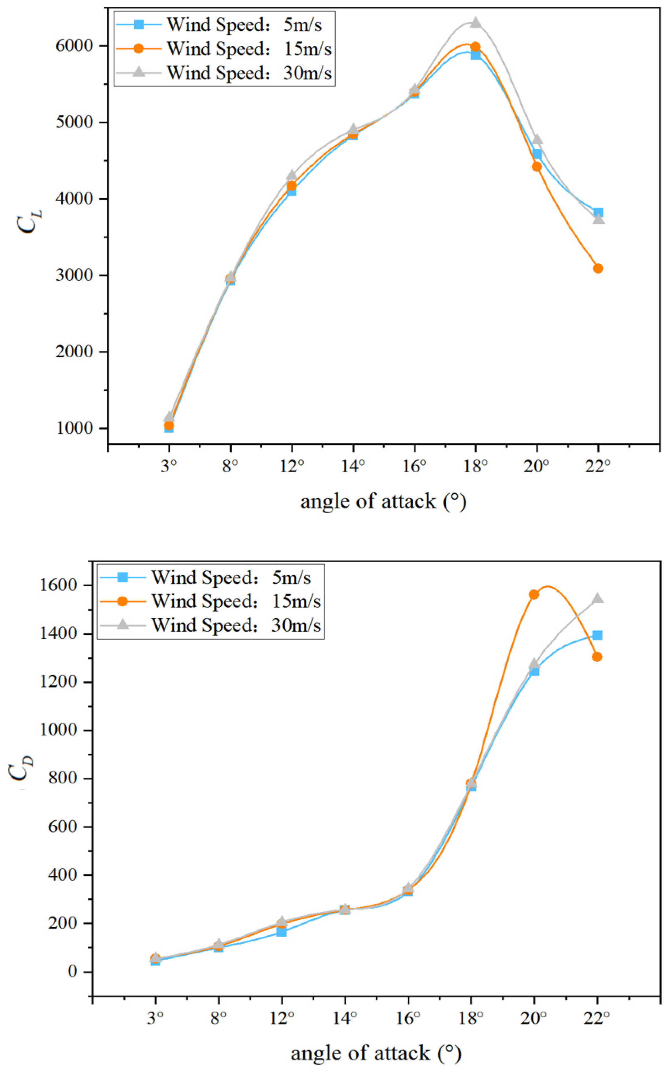 3, covering an angle-of-attack range from 3° to 22° under three representative freestream velocities (5 m/s, 15 m/s, and 30 m/s). The variations in lift coefficient and drag coefficient under these conditions were obtained, as shown in the