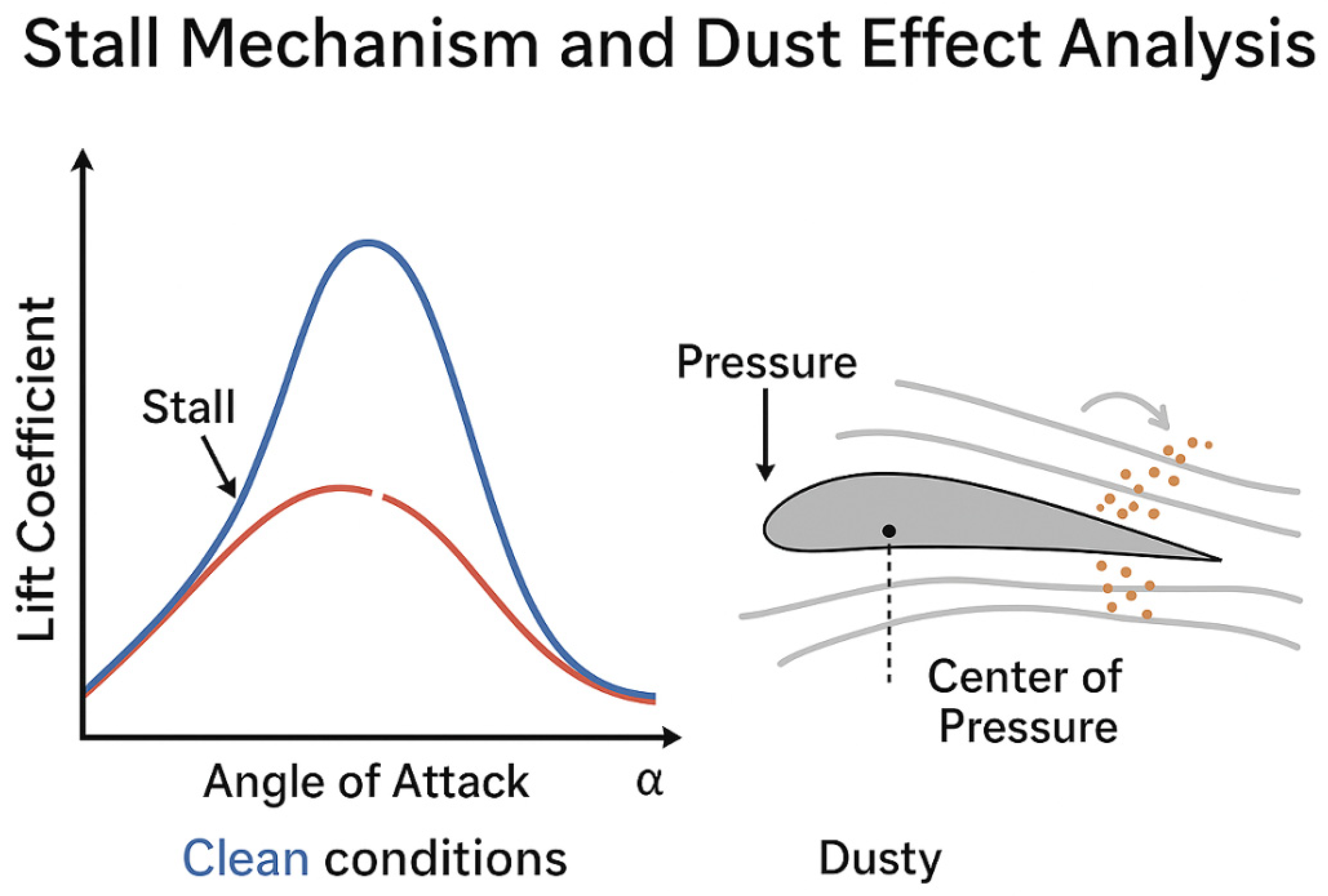 The presence of sand and dust particles further disturbs the development of the boundary layer, triggering earlier transition and separation, thereby causing stall to occur sooner. This manifests as a steeper post-peak lift drop and faster drag growth.