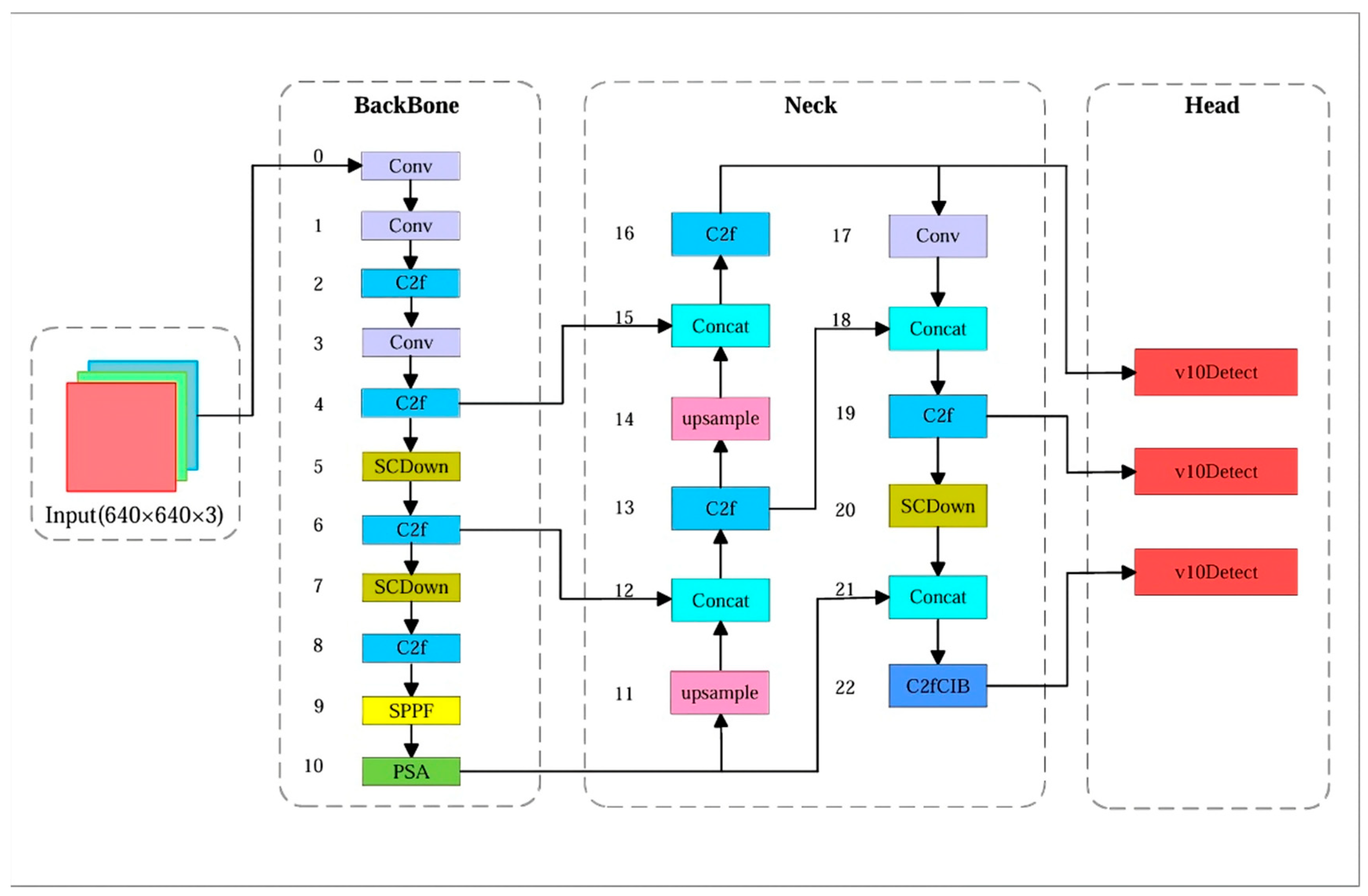 The YOLOv10 series of models has demonstrated outstanding performance in multiple computer vision tasks, including object detection, visual classification, and instance-level semantic segmentation. This series offers five model variants based on the balance between computational efficiency and detection accuracy, namely Nano (n), Small (s), Medium (m), Large (l), and Extra-large (x). These variants are designed to meet different resource limitations and accuracy requirements. The n version is specifically tailored for ultra-lightweight and high-speed deployment on edge devices, while the gradually larger types (s, m, l, x) will contain more parameters and computational complexity, achieving higher detection accuracy while increasing inference latency. In this study, we selected the computationally least intensive YOLOv10n as the base network architecture to meet the stringent requirements for real-time inference in practical application scenarios.