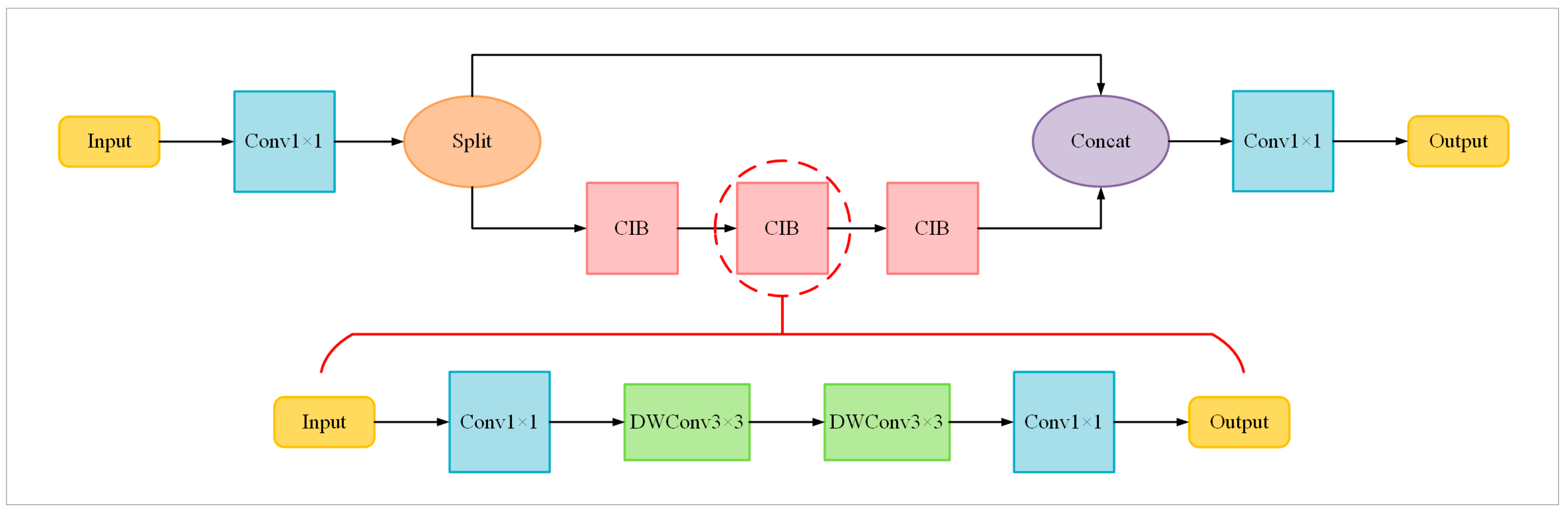 To optimize model computational efficiency and adapt to edge device deployment requirements, this study adopts the Context Interaction Bottleneck Module (C2fCIB) based on deep separable convolutions proposed by Wang et al. This module is a lightweight modification of the original C2f module in the YOLO architecture, particularly suitable for processing deep features in the backbone network. Its core design involves constructing an inverted bottleneck structure using deep separable convolutions in the feature propagation path, as shown in