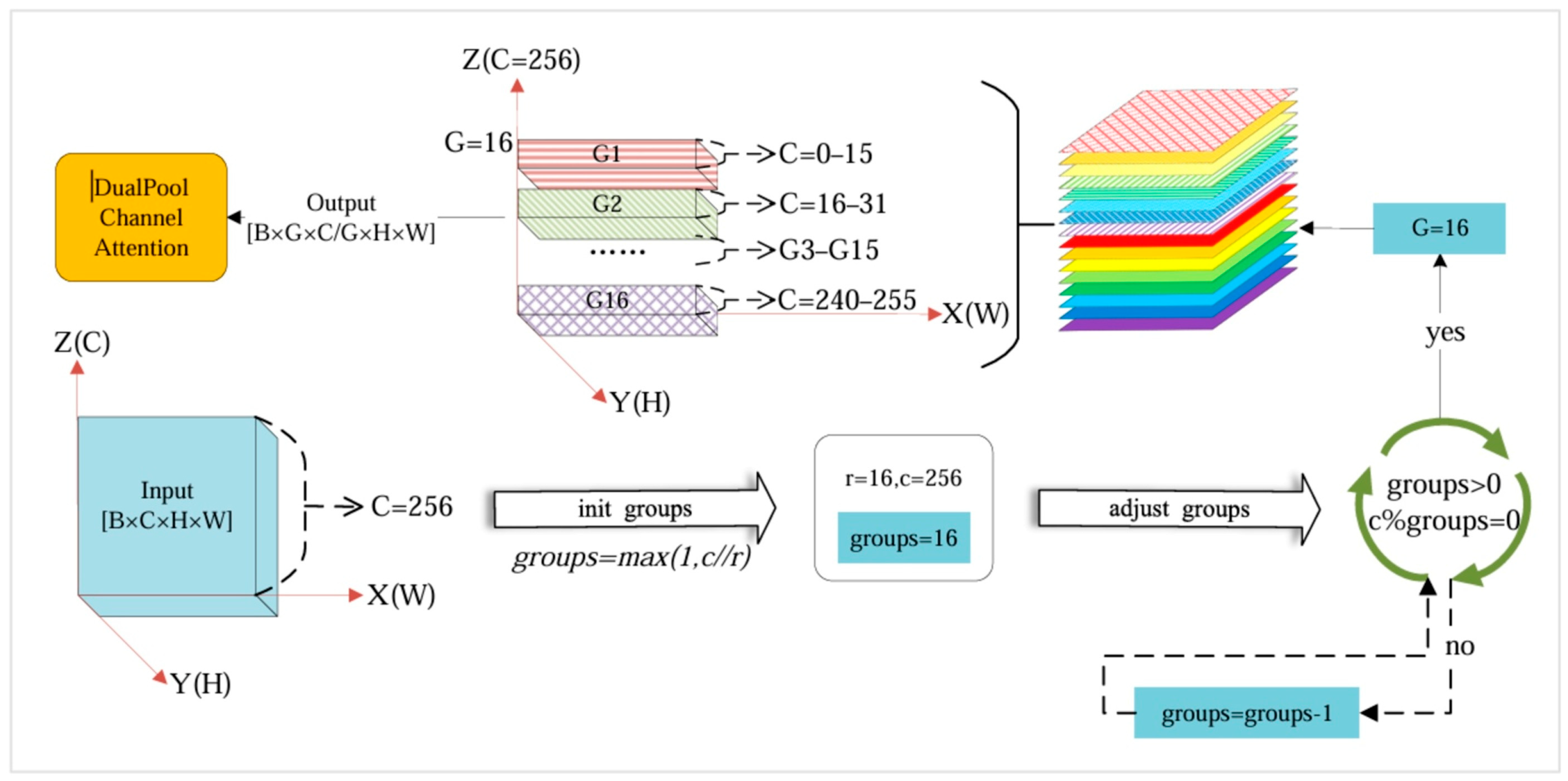 Coordinated adaptive dynamic grouping mechanism: Adaptively adjust the number of groups based on the number of input channels to ensure optimal channel division, improve the model’s generalization ability and feature utilization, and reduce intra-group redundancy.