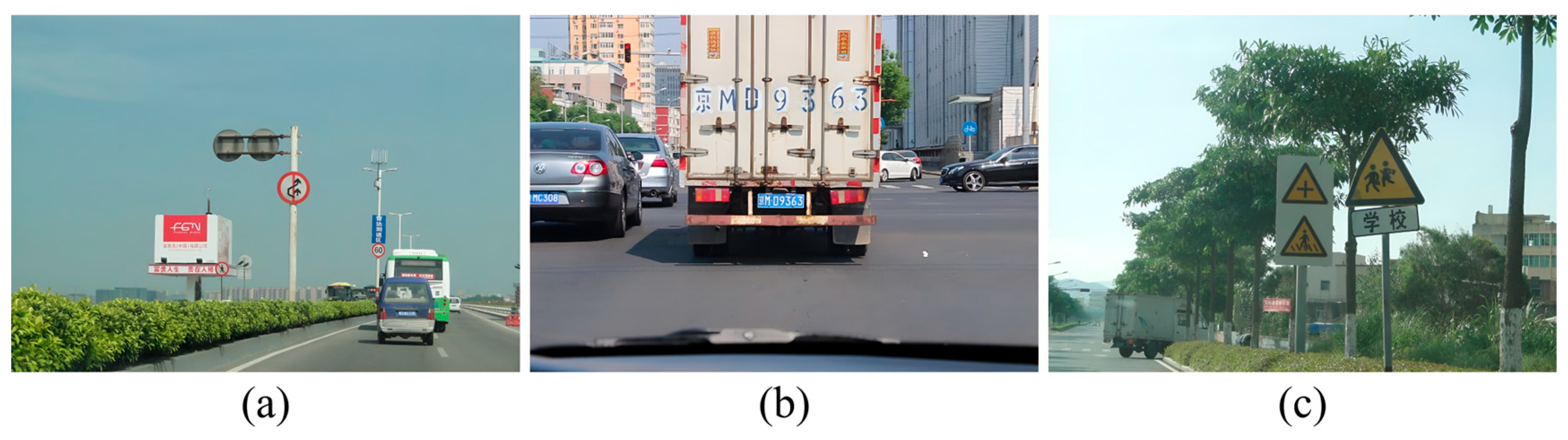 31] traffic sign dataset created by the Changsha University of Science and Technology team, which provides 20,492 traffic sign images covering three typical categories of signs: warning, mandatory, and prohibitory. These categories comprehensively cover the core functional categories of China’s traffic regulatory system.