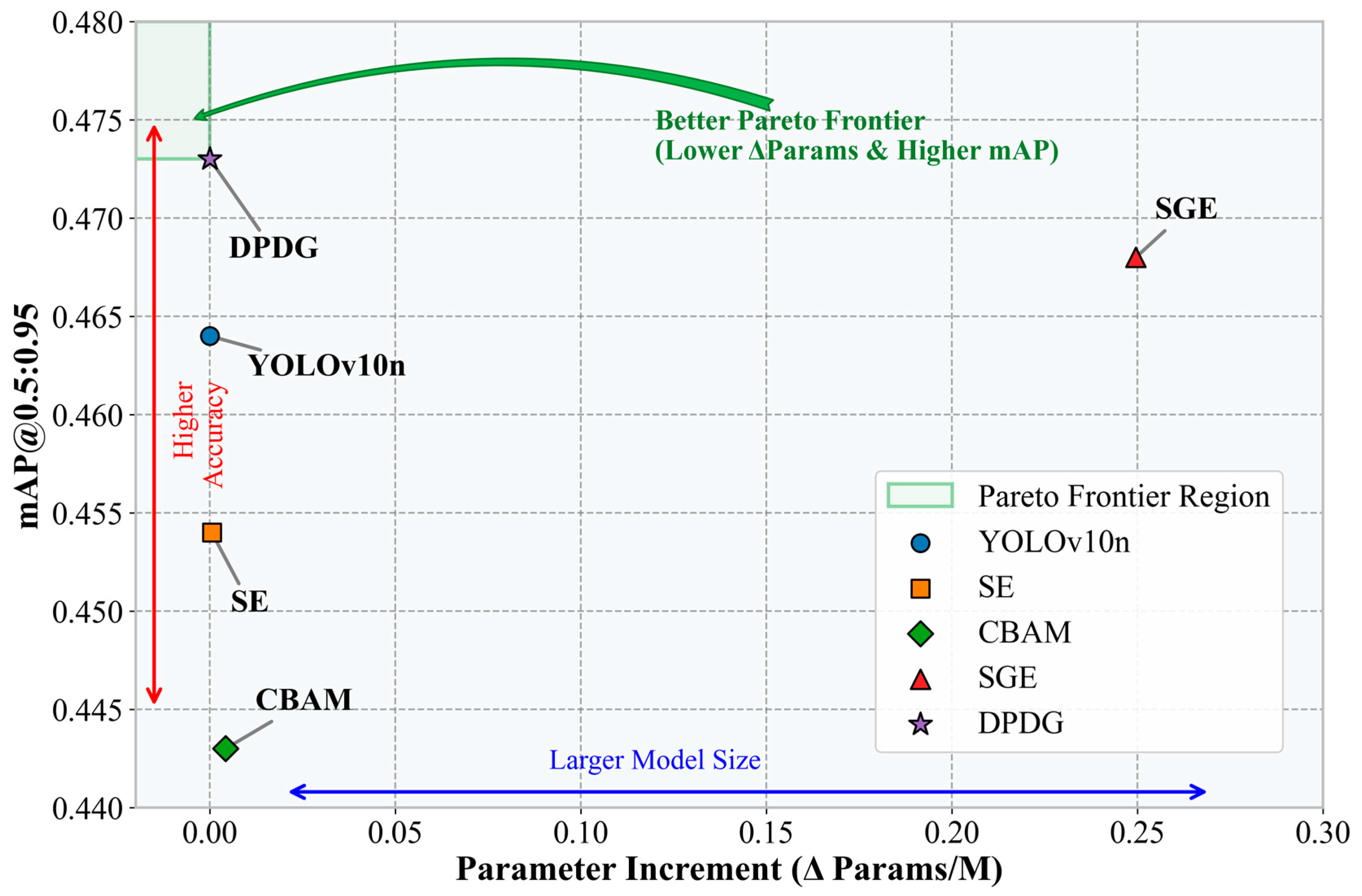 33] composed of model complexity (incremental parameter count ΔParams/M) and detection accuracy (mAP@0.5:0.95), the DPDG module is located in the upper-left region of the Pareto front. The Pareto frontier represents the boundary solution set where all objectives cannot be improved simultaneously in a multi-objective optimization problem. The upper-left region signifies the ideal direction of minimizing model parameter counts while maximizing accuracy. This Pareto optimality clearly demonstrates the effectiveness of the DPDG module in balancing accuracy and efficiency, i.e., significantly enhancing the robustness of sign detection in complex traffic scenarios without significantly increasing computational overhead.