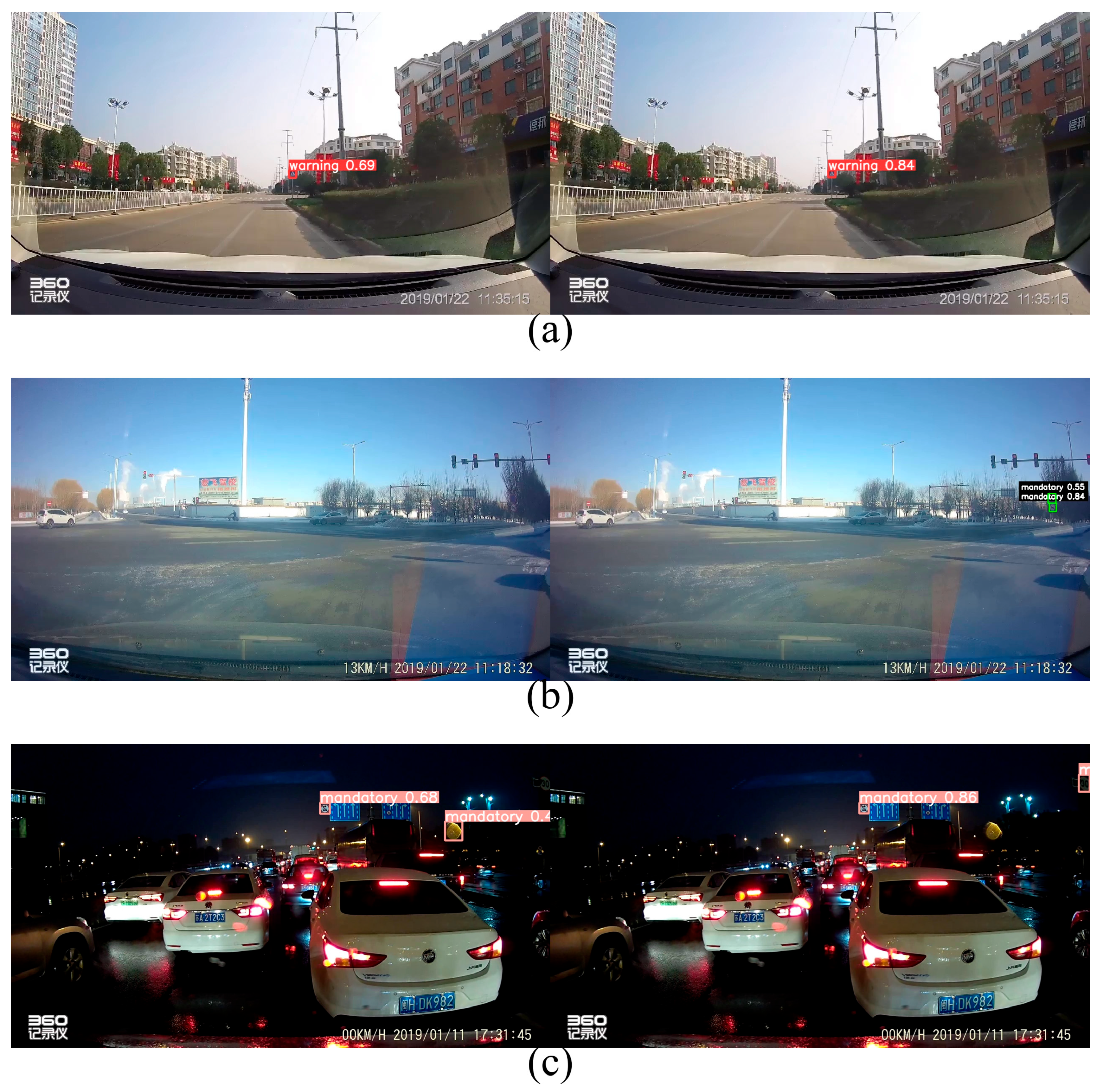 Figure 11, we conducted a comparative analysis of the detection results of YOLOv10n and its improved model, YOLO-DPDG. From sample (a), it can be seen that YOLO-DPDG demonstrates higher detection accuracy. From sample (b), it can be seen that when handling small objects at long distances, YOLO-DPDG exhibits more comprehensive detection capabilities, successfully identifying traffic signs that the original model missed. From sample (c), it can be seen that in low-light nighttime scenes, YOLO-DPDG effectively suppresses false detections caused by headlight reflections. At the same time, the original model mistakenly identifies reflections as traffic signs. In summary, the improved algorithm proposed in this paper effectively alleviates issues such as insufficient feature expression capabilities and difficulties in identifying small objects, thereby enhancing the model’s robustness and accuracy.