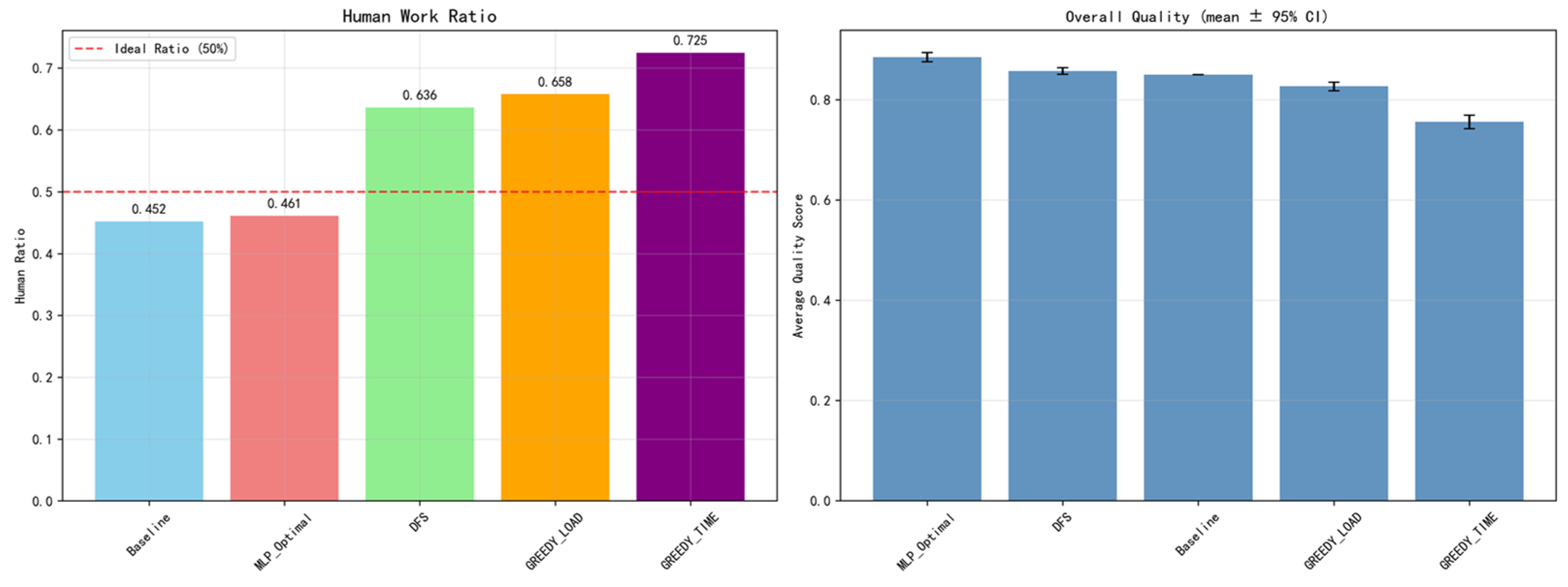 First, we conducted simulation comparisons based on the optimal sequences generated by each method. As shown in Figure 9, in terms of the comprehensive quality dimension—composed of three types of sequence structural features with weighted values: balance (40%, requiring the Human–Robot work ratio to be close to 0.5), collaboration efficiency (30%, requiring the role switching frequency to be within a reasonable range), and task continuity (30%, requiring the maximum continuous task duration for the same executor to not be excessively long)—MLP_Optimal significantly outperforms other methods. Specifically, the average comprehensive quality of MLP_Optimal is 0.8846, which is higher than that of DFS (0.8572), Baseline (0.8500), GREEDY_LOAD (0.8268), and GREEDY_TIME (0.7558). This indicates that MLP_Optimal has greater advantages in the overall optimization of balanced task allocation, reasonable switching rhythm, and continuity constraints.