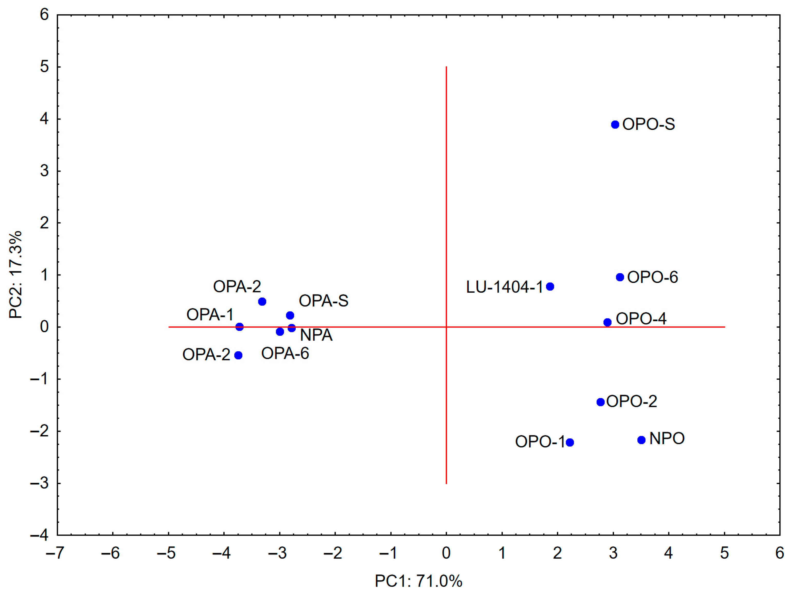 - Potato starch treated for 6 h, suspension concentration 30%, 1.5 min retention time (ozone dose of 4.32 g ± 0.16 g per 1 kg of starch).