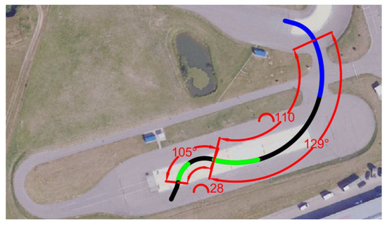 A two-turn maneuver was chosen as the main test maneuver. The electric vehicle was driven through two turns without braking with the brake pedal. The data recorded by the equipment enables us to determine whether the electric vehicle starts to slip due to the activation of the regenerative system or due to a simple loss of traction caused by excessive speed on a slippery turn. The maneuver performed is shown in Figure 2.