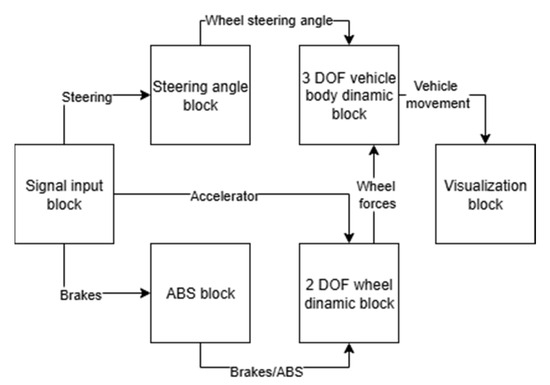 Figure 3 presents a basic overall schematic of the simulation model, in which the signal input block, steering mechanism block, braking system with ABS block, two degrees-of-freedom (DOF) wheel dynamics block, three DOF vehicle body dynamics block, and the output and visualization block for motion characteristics are arranged sequentially.