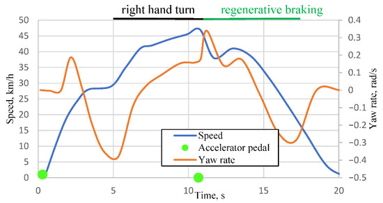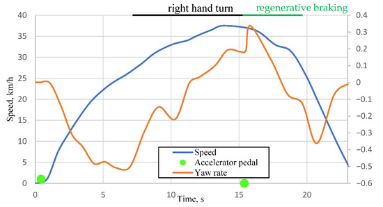 In Figure 4, the green markers represent accelerator pedal positions. The first marker (value 1) corresponds to pedal depression, which remains constant until the second marker, indicating pedal release (value 0). It can be observed from the orange curve in the graph that the maneuver begins with a right-hand turn, followed by a left-hand turn, during which the accelerator pedal is released at 15.39 s. Due to the mounting position of the yaw rate sensor, the negative yaw rate represents the car turning left, and the positive represents the car turning right. Comparing Figure 2, the beginning of the maneuver is a long right-hand turn with a regenerative braking zone indicated in green. We can see in Figure 3 that from 1 s to 7 s the car is getting into position for the maneuver, and the maneuver begins at 7 s as a right turn indicated by a positive yaw rate. At 15.39 s the car comes into the regenerative braking zone (green zone in Figure 2) and begins regenerative braking. Based on the yaw rate (orange curve), an increase in angular velocity is observed from 0.189 rad/s (at 15.5 s) to 0.337 rad/s (at 15.85 s), corresponding to a change of 8.48 °/s and a yaw acceleration of 0.457 rad/s2. The maximum yaw acceleration of the vehicle during regenerative braking was found to be 0.188 °/s2. Very similar results were consistently obtained in subsequent experiments.