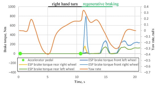 These signals are transmitted to the ABS as commands to generate specific braking torque at each wheel. Based on these signals, it can be confirmed that the electric vehicle detected a reduction in stability starting at 10.67 s, leading to braking commands being applied to the front right and rear right wheels. The front wheel received a braking torque of 789 Nm at 11.59 s, while the rear wheel received 162 Nm at 11.39 s. Since the maneuver involved a left-hand turn, it can be concluded that the activation of regenerative braking induced excessive oversteer. Consequently, the ESP system intervened by braking the wheels on the right-hand side, thereby mitigating the oversteer effect.