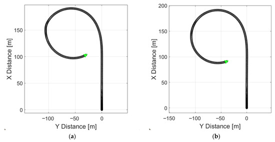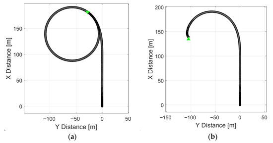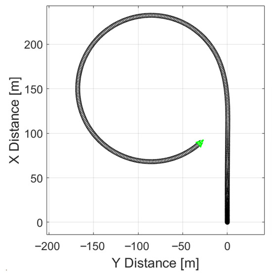 Figure 9b illustrates vehicle motion on a high-grip surface (μ = 0.85). In this case, no signs of stability loss were indicated, as the trajectory indicates that the vehicle performs a uniform turn without experiencing either excessive or insufficient yaw.