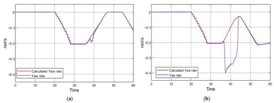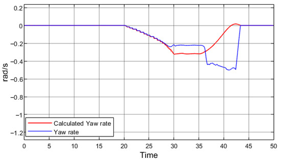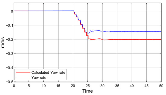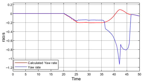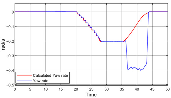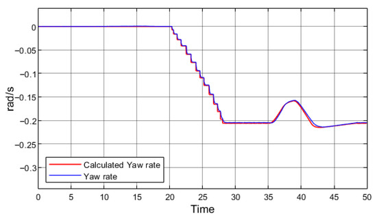 where r is the yaw rate, v—vehicle speed, R—turning radius, L—vehicle’s wheelbase, and δ—vehicle’s steering angle. The yaw rate calculated using this equation is compared with the sensor data in a real vehicle or with the simulated outputs of the vehicle body dynamics block in the model. The difference between these two values indicates whether the vehicle is experiencing excessive or insufficient yaw. Figure 8 presents the yaw rate data obtained from the simulation with regenerative braking.