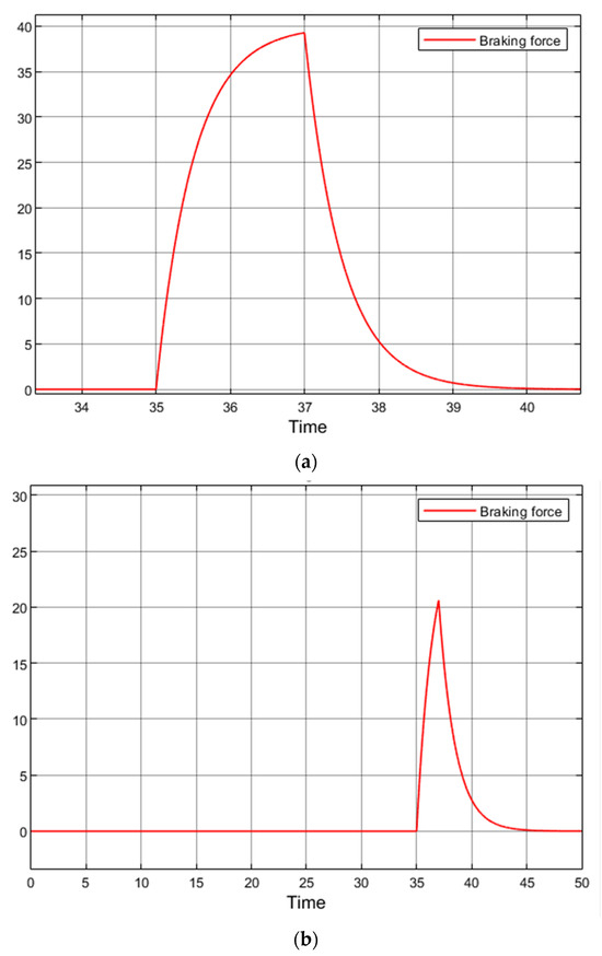 When the rate of increase in the braking command signal is reduced, the electric vehicle maintains stability. However, within 2 s the signal only reaches 20% of the maximum braking torque limit, instead of the intended 40% (Figure 16b). Consequently, the efficiency of regenerative braking is reduced.
