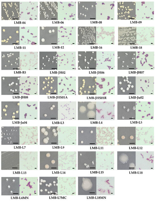 From 2.02 × 105 CFUs per gram of intestine, 31 colonies exhibiting distinct characteristics based on macroscopic and microscopic observations were isolated (Figure 1).
