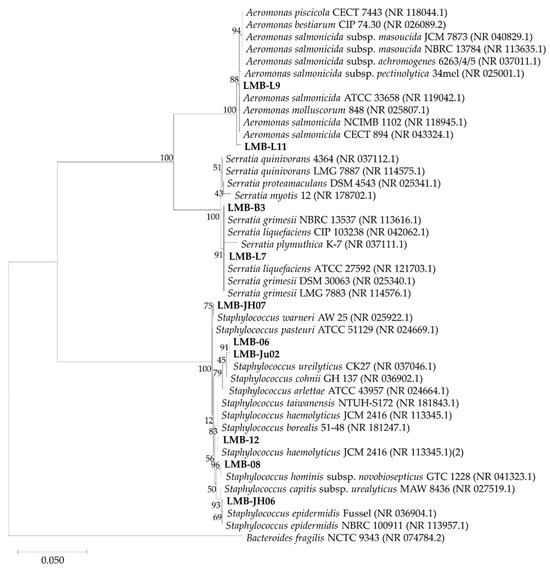 Representative maximum likelihood phylogenetic tree based on the 16S rRNA gene sequences of lipase-producing bacterial isolates LMB-B3, LMB-06, LMB-L7, LMB-08, LMB-L9, LMB-L11, LMB-12, LMB-JH06, LMB-JH07, and LMB-Ju02. Numbers next to the branches indicate the percentage of bootstrap replicates supporting each node. The scale bar represents the number of substitutions per site. The 16S rRNA gene of Bacteroides fragilis NCTC 9343 was used as an outgroup.