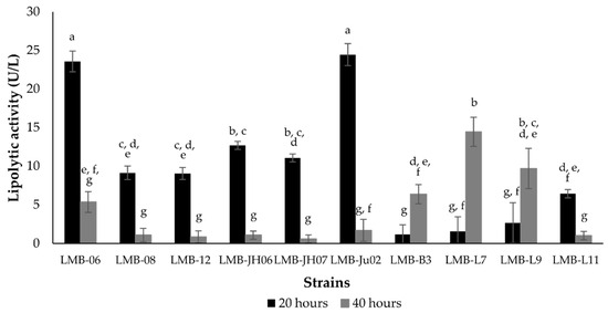 Lipolytic activity (U/L) of crude secretomes from preselected bacterial strains cultured for 20 and 40 h in production medium A. Enzymatic activity was determined at 37 °C and pH 7.0 using pNPL as the substrate. Values represent the mean of three independent replicates (n = 3); error bars indicate standard deviations (SD). Statistical significance of lipolytic activities between isolates grown for 20 h or 40 h is indicated by lowercase letters (a, b, c, d, e, f, g). All comparisons were analyzed using two-way ANOVA (strain x hours) followed by Tukey’s HSD post hoc test (p < 0.05).