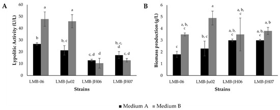 As depicted in Figure 5, the performance of selected Staphylococcus isolates was evaluated in two different production media. Results indicated that both isolate identity and culture medium significantly influenced lipolytic activity and biomass formation (p < 0.05). Strains LMB-06 and LMB-Ju02 exhibited higher lipolytic activity in both media being 1.7 and 2.2 more productive in Medium B (47.8 and 45.9 U/L, respectively). In contrast, strains LMB-JH06 and LMB-JH07 showed no significant differences between the two media, producing 12.8 and 17.3 U/L in Medium A, and 10.4 and 12.9 U/L in Medium B, respectively. Moreover, all four strains demonstrated improved growth in Medium B, with LMB-06 and LMB-Ju02 generating nearly twice the biomass compared to Medium A. Thus, S. ureilyticus strains LMB-06 and LMB-Ju02 were selected for subsequent lipase production assays in Medium B to further assess their lipolytic potential.
