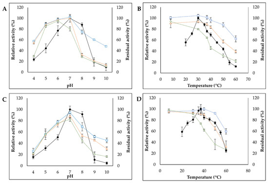 Effect of pH and temperature on the lipase activity and stability of secretomes from S. ureilyticus strains LMB-06 (A,B) and LMB-Ju02 (C,D), cultured for 20 h in production Medium B. Relative activity (%) was calculated by considering the maximum lipolytic activity as 100%; Residual activity (%) was determined after preincubation of the enzymatic extract at different temperatures or pH values, using the initial activity as 100%. Enzymatic activity was assayed at pH 7.0 using pNPL as the substrate. Filled circles (●) represent the effect of pH or temperature on enzyme activity; unfilled symbols represent the effect on enzyme stability after 1 (□), 4 (△) and 18 h (◇) of incubation. Values represent the mean of three independent replicates (n = 3); error bars indicate standard deviations (SD).