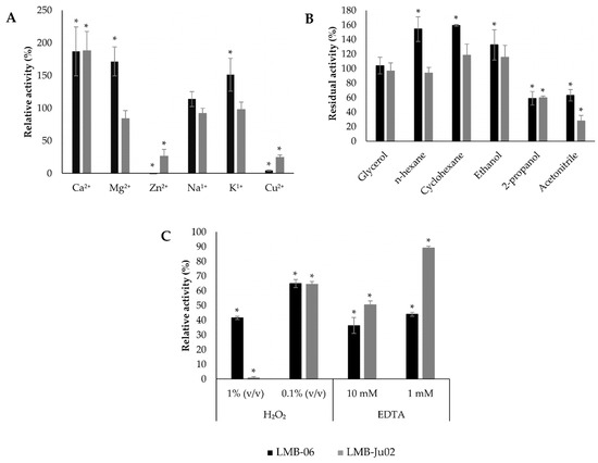 Hydrogen peroxide is a compound that frequently coexists with lipases in oleochemical reaction systems. It induces oxidative modification of amino acid residues such as cysteine, methionine, and tryptophan, which can lead to the disruption of disulfide bonds. These structural changes result in protein aggregation and consequent loss of enzymatic activity [65,75]. As shown in Figure 7C, the addition of 1% [v/v] H2O2 almost completely inhibited the activity of the lipases from strain LMB-Ju02, while significantly reducing the activity of those from strain LMB-06 by 59.8%. At a lower concentration (0.1% [v/v]), both strains maintained about 60% of their activity. These values indicate greater sensitivity to H2O2 when compared to the lipase SCNL from S. caprae NCU S6, which has been reported to retain higher activity under similar conditions [65].
