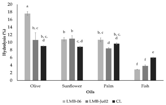 As shown in Figure 8, the lipases secreted by the S. ureilyticus strains LMB-06 and LMB-Ju02 hydrolyzed the vegetable oils to a considerably greater extent compared to the fish oil. In contrast, Xie (2012) [63] reported that lipases from S. epidermidis and S. aureus exhibited higher hydrolysis rates for fish oil than for olive oil, which may be attributed to differences in substrate specificity, as well as other factors such as oil quality. The lipases from strain LMB-06 achieved the highest hydrolysis rate with olive oil (17.6%), followed by sunflower oil (10.8%) and palm oil (10.7%), with no significant difference between the latter two, while the lowest hydrolysis level was observed with crude fish oil (2.9%). The lipases from strain LMB-Ju02 exhibited the highest hydrolysis rates with sunflower oil (11.0%) and olive oil (10.6%), with no statistically significant difference between them, whereas lower hydrolysis levels were obtained with palm oil (8.4%) and crude fish oil (3.8%). The hydrolytic performance of the commercial lipase, used as a positive control, was consistent across the three vegetable oils, with hydrolysis rates ranging from 8.8% to 9.7%. In the case of anchovy oil, although the hydrolysis rate was lower compared to the vegetable oils, the commercial lipase exhibited higher activity (6.0%) than the lipases secreted by both S. ureilyticus strains.