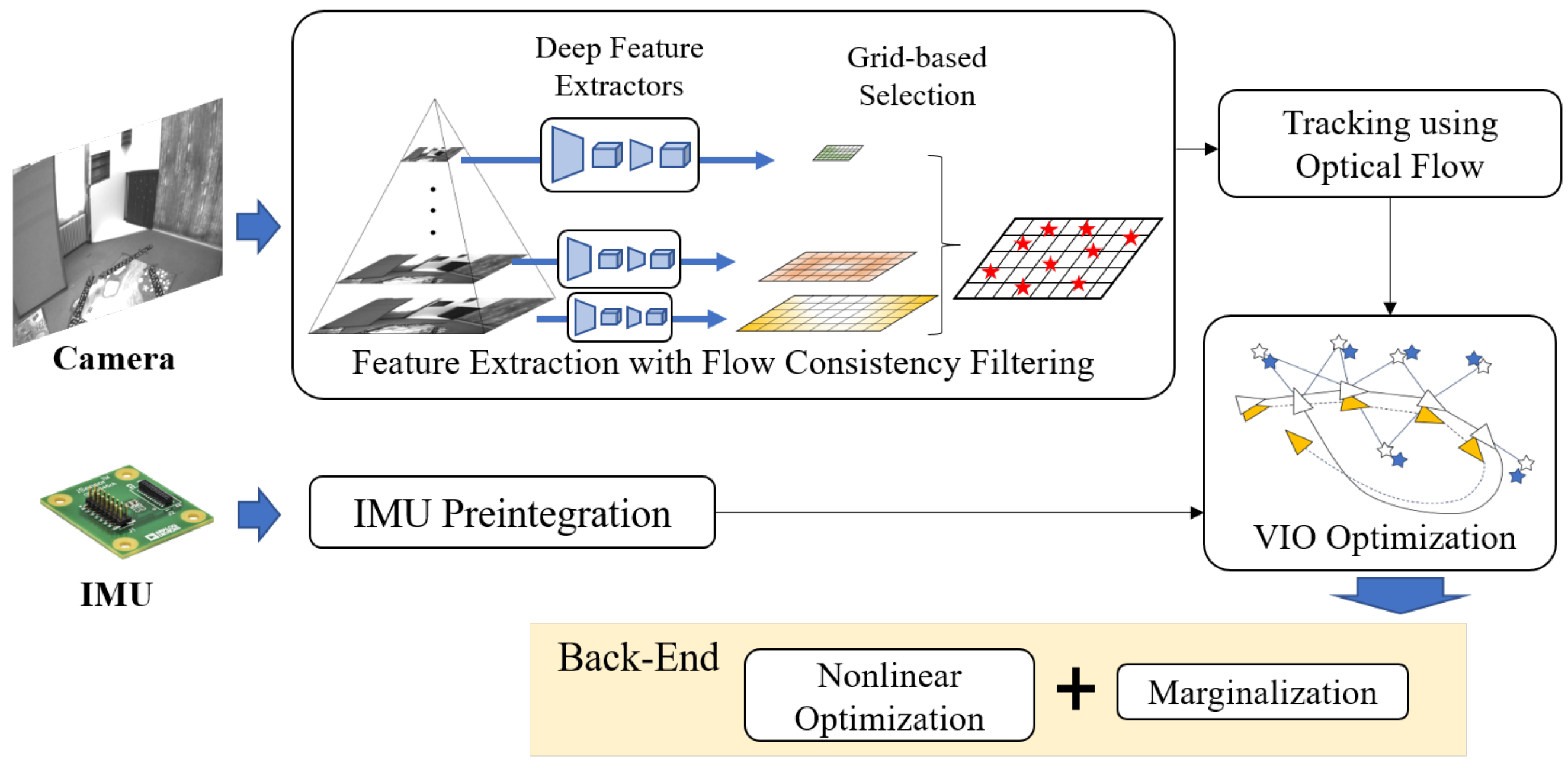 A hybrid front-end for visual–inertial odometry is developed by integrating a lightweight deep feature extractor with an image pyramid and grid-based keypoint sampling strategy, ensuring spatial diversity of extracted features.