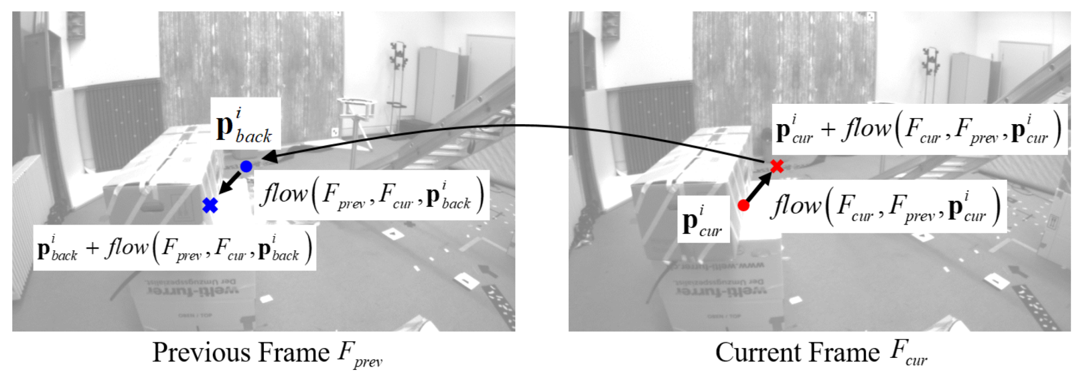Figure 3, this filtering process enhances stability and leads to more reliable tracking by removing temporally inconsistent keypoints. While features are extracted from a multi-scale image pyramid, all optical-flow fields are upsampled to the highest resolution before computing the forward–backward consistency error. This approach ensures that the consistency evaluation benefits from the higher accuracy of full-resolution flow estimation, eliminating the need for level-wise scaling.