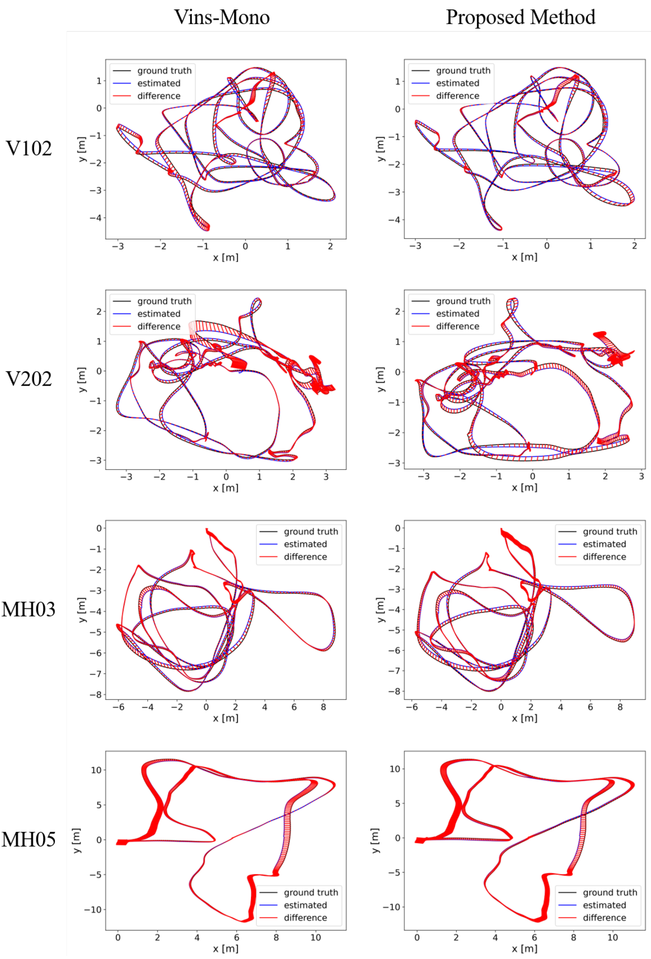 Table 1 presents the absolute trajectory RMSE for all evaluated methods on the EuRoC MAV dataset. The results reveal that the proposed method achieves robust and consistent tracking performance across diverse scenarios. To provide a clearer quantitative comparison, the table also reports the average percentage improvement of the proposed method over VINS-Mono, which is the primary baseline.