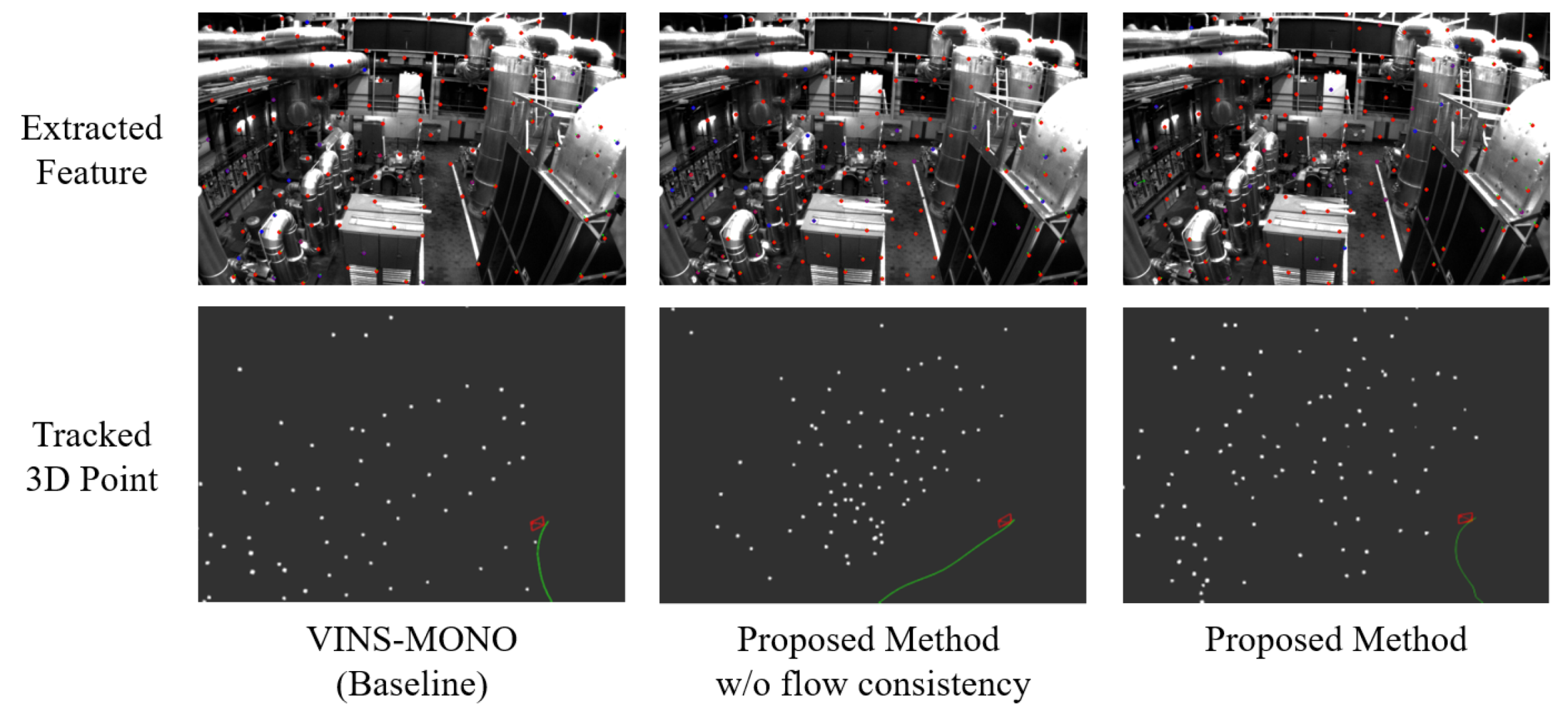 For tracking, we retain the original optical-flow-based method from VINS-Mono, using a pyramidal Lucas–Kanade tracker. Flow-guided filtering is implemented by computing bidirectional flow between frames and comparing the displacement of forward–backward matches. Points with inconsistency beyond a threshold are removed before being passed to the front-end estimator.