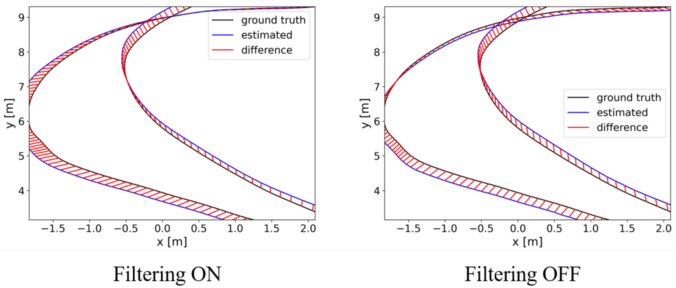 Figure 6 presents side-by-side trajectories estimated with filtering (left) and without filtering (right). Although both results follow a similar overall path, the filtered version shows smoother motion and less local drift, especially in curved regions where deviations are most evident. This visual comparison clearly demonstrates that enforcing bidirectional flow consistency enhances temporal stability in feature tracking.