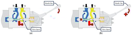 The proportional valve group 32 (PVG32) has been applied in various engineering fields []. The present paper will investigate the diagnosis of the PVG32 spool stick fault. The schematic diagram of the valve is presented in Figure 1. In accordance with the operational requirements, the handlebar is to be rotated in a clockwise direction, as illustrated in Figure 1a. Subsequently, the spool is shifted to the left side of the valve house, where the fluid is directed towards the action unit, thereby executing its designated power function.