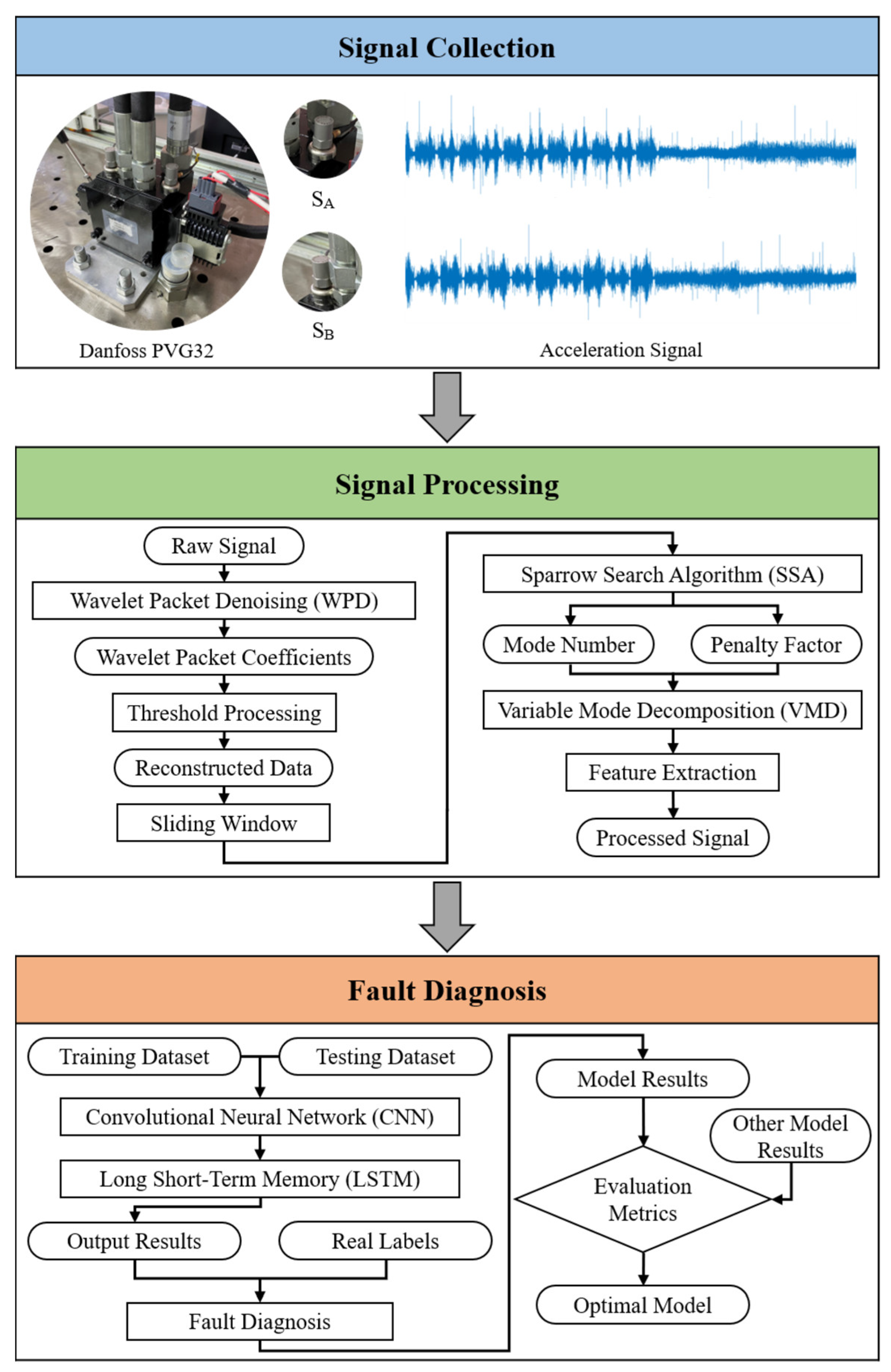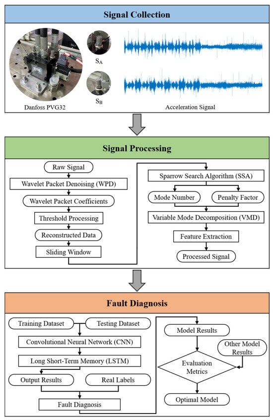 As demonstrated in Figure 2, the proposed research method (WPD-SSA-VMD-CNN-LSTM) comprises three primary procedures: signal collection, signal processing and fault diagnosis.