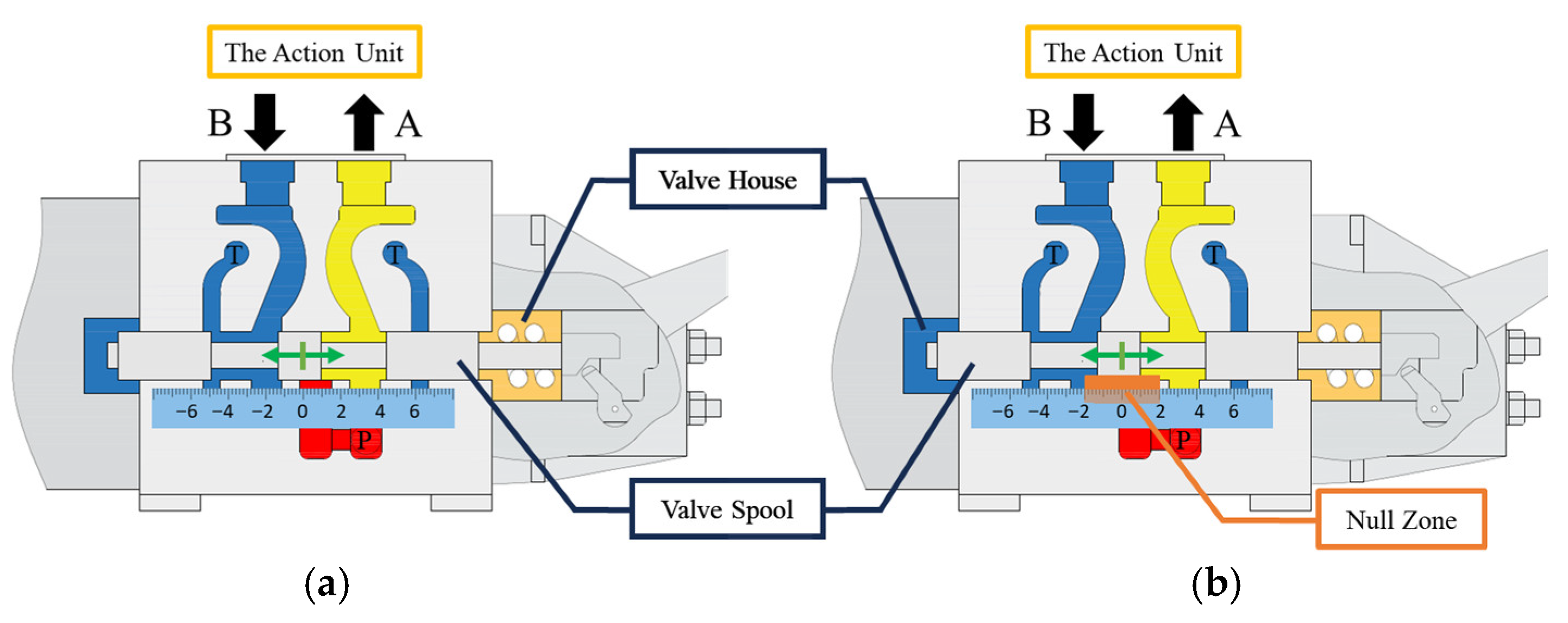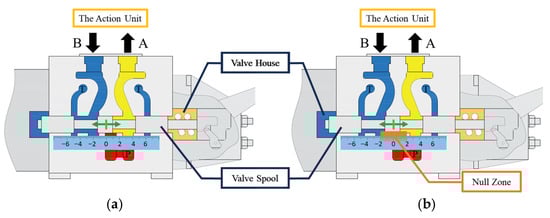 The operational range of the valve spool. (a) The movement range. (b) The null zone.