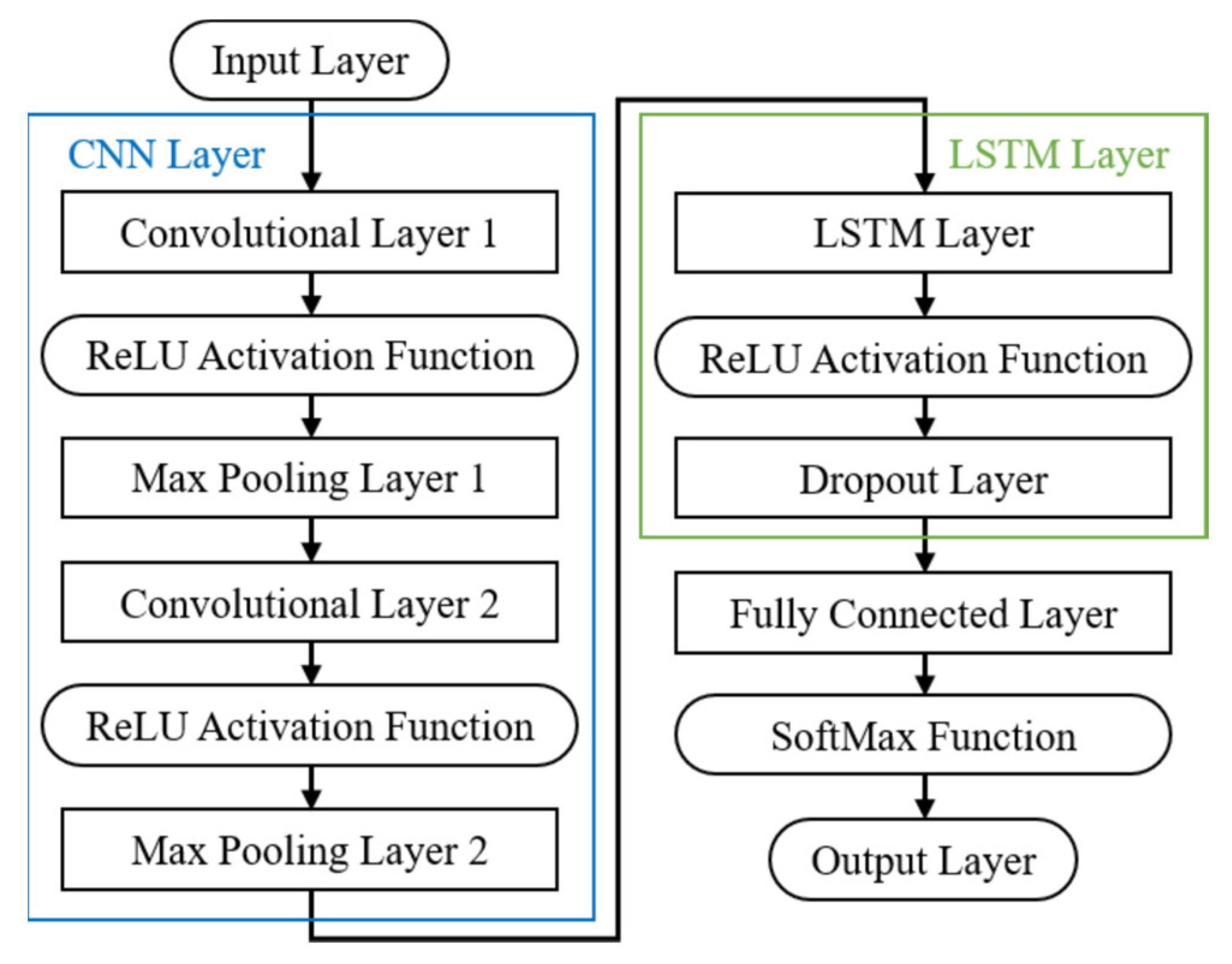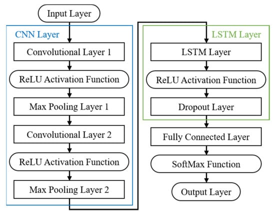 Nevertheless, the limited ability of CNN to handle long-range dependencies in sequential data, and the LSTM challenge to capture long-term dependencies in sequential data, are two crucial obstacles to their further deployment in the fault diagnosis []. Thus, researchers have sought to integrate CNN with LSTM as a potential way to strengthen their characteristics for addressing complex tasks involving spatial and temporal dependencies. Xiang et al. have focused their research on the fault detection in wind turbines due to the complicated practical conditions involved []. The CNN model was integrated with the LSTM model as the proposed method to predict the early occurrence of faults and provide computable decision-making support. In addition, the CNN-LSTM model was used by Guo et al. for the hydraulic system fault diagnosis []. In this research, the strengths of CNN for feature extraction and LSTM for time series processing were combined. The model achieved an identification accuracy of 98.56% for different fault types.