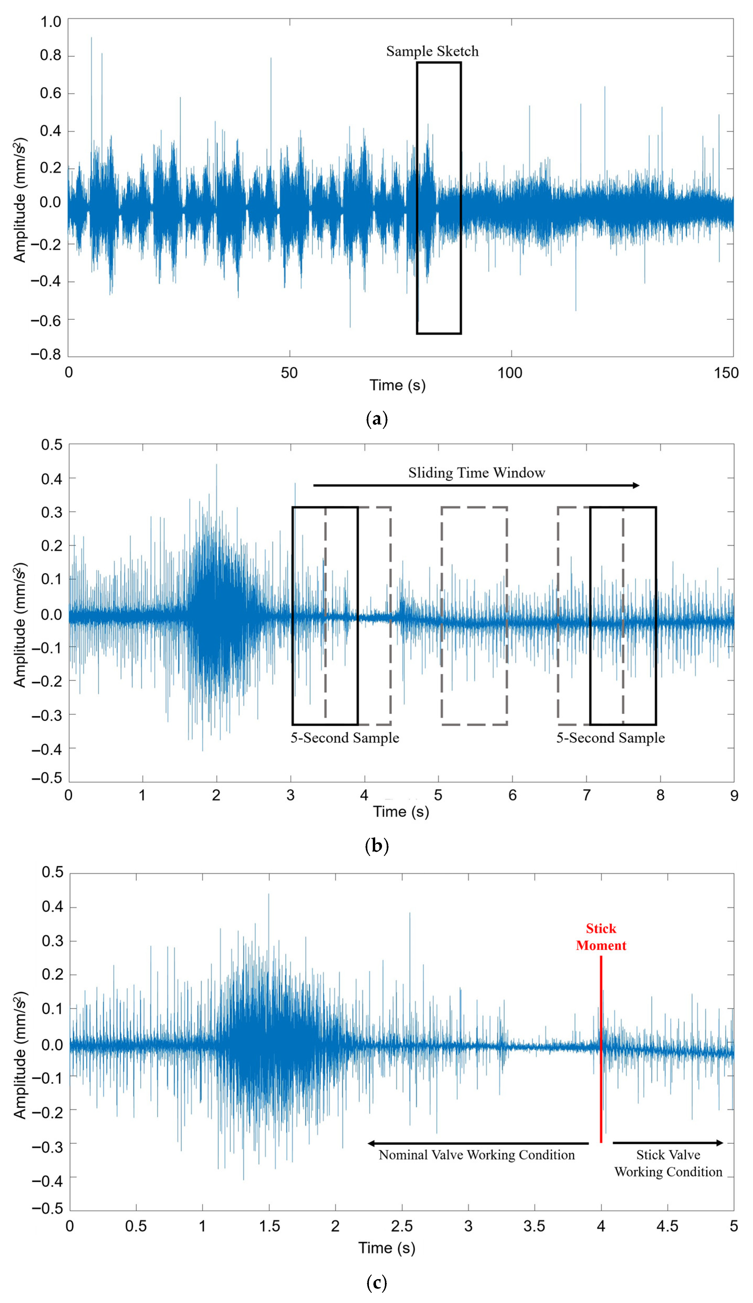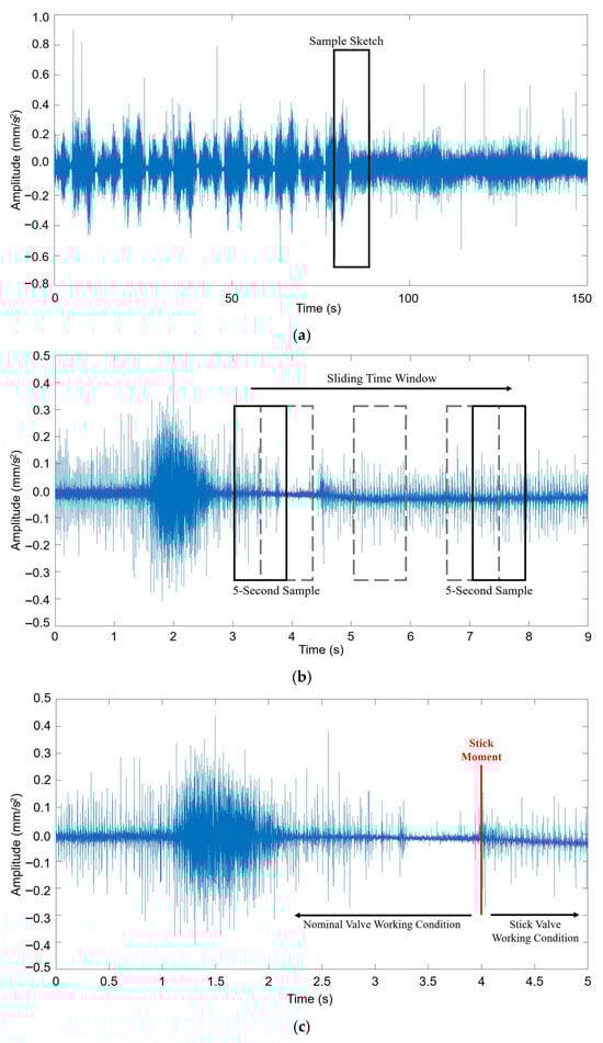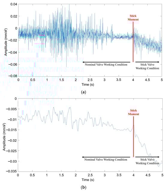 At each of these positions, the spool was forcibly held, simulating a “stuck” condition. Subsequently, vibration data (signals SA and SB) were collected over a sufficient duration under this fault state. The process yielded a comprehensive dataset encompassing both normal movement and various fault scenarios. Consequently, this facilitated the identification of not only the occurrence of a stick fault, but also the precise position at which the spool was stuck.