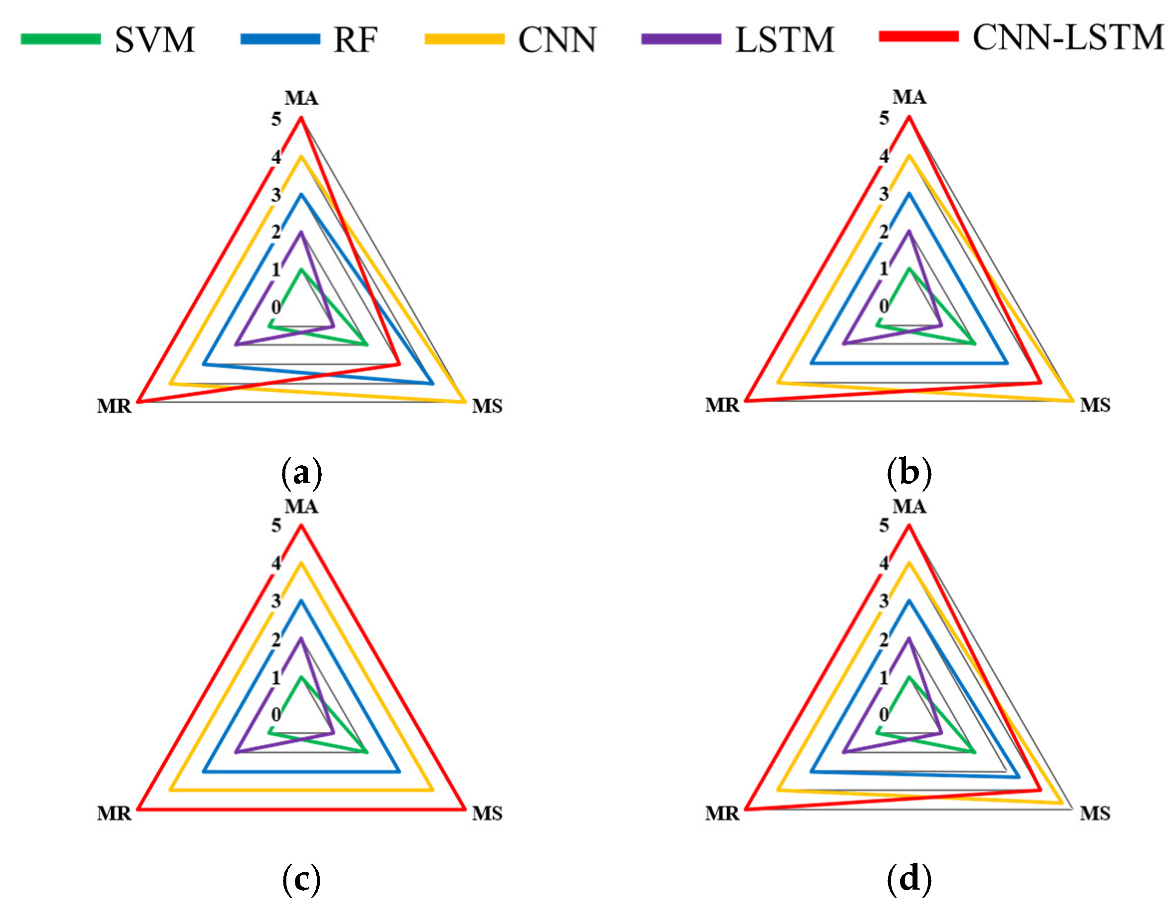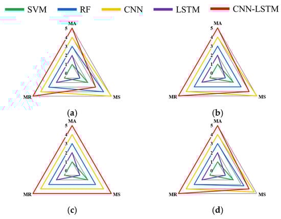 - The CNN-LSTM model has been demonstrated to be the superior diagnostic architecture. The comprehensive model comparison in Section 4.2, evaluated using the MA, MS, and MR indices, conclusively demonstrated that the hybrid CNN-LSTM model outperformed all benchmark models (SVM, RF, CNN, LSTM). As outlined in Table 5 and Figure 9, the model demonstrated the highest Model Accuracy (MA) of 97.01% and 96.24% for individual sensors, and an impressive 99.55% for the fused sensor group. While its Model Stability (MS) was marginally lower than that of the CNN model in certain single-sensor scenarios, it exhibited the most consistent and reliable performance overall, as demonstrated by its superior Model Reliability (MR) scores. This finding serves to validate the design hypothesis that the combination of CNNs’ spatial feature extraction and LSTMs’ temporal modelling creates a more powerful diagnostic tool.