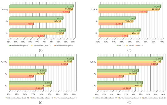 Considering the number of kernels in two convolutional layers, the likely parameters are determined to be 16 in the 1st convolutional layer and 32 in the 2nd convolutional layer. The largest reduction is observed in the 2nd convolutional layer with 16 kernels on the SB sensor, with a decrease of 1.73%. The least improvement (0.08%) is observed in the 1st convolutional layer with 32 kernels at the SA sensor. The overall increase in accuracy of both convolutional layers with different kernels is no greater than 0.30%. Thus, the use of larger kernels leads to higher levels of accuracy, but the benefits are limited, as shown in Figure 10c,d.