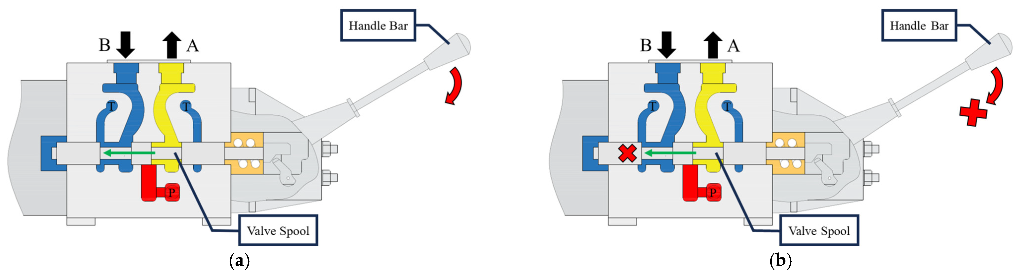 The working principle and fault of the PVG32. (a) The nominal condition. (b) The spool stick fault.