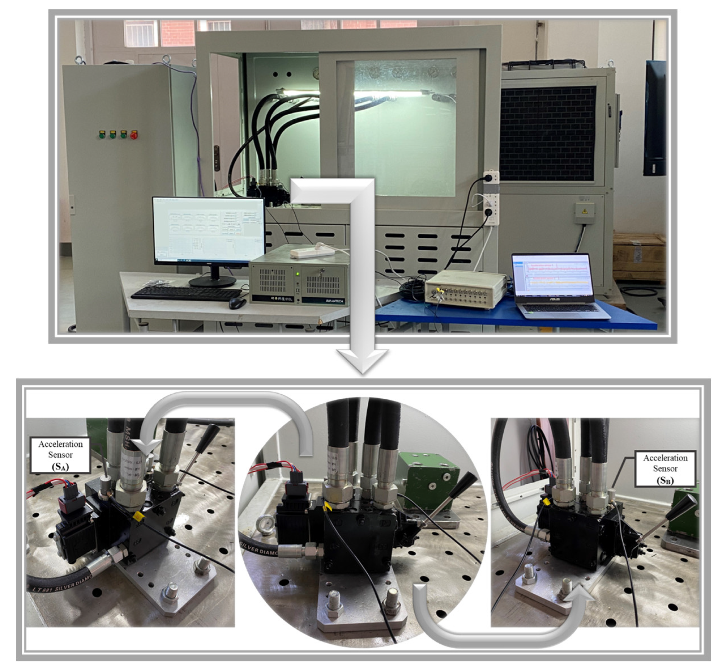 The primary data acquired for fault diagnosis were vibration signals, as they are highly sensitive to mechanical faults such as sticking spools. The employment of two high-sensitivity acceleration sensors (model: CT1010LC) was necessary in order to capture the aforementioned vibrational responses. The sensors were attached to two distinct ports (designated Port A and Port B) on the valve body, as illustrated in Figure 3. The employment of a dual-sensor configuration was instrumental in the documentation of potential asymmetrical vibration patterns. The induction of these patterns was attributed to the malfunction of the spool. The signals from these sensors were labelled SA and SB, respectively. The data acquisition system was configured with a sampling frequency of 4000 Hz []. This rate was selected to ensure the capture of the pertinent vibration frequency components associated with the valve’s operation, while maintaining an optimal data volume. As outlined in Table 1 the equipment and software utilised during the course of the experiments is enumerated.