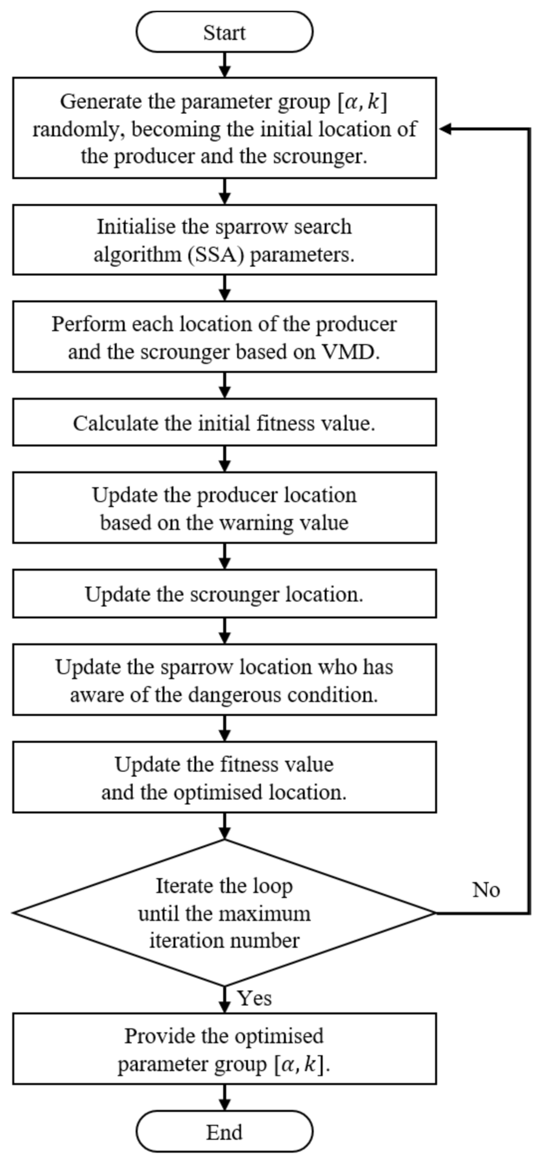 The performance of VMD is significantly influenced by two key parameters: the quadratic penalty factor () and the decomposed mode number (). The conventional approach is to manually select these parameters based on experimental results or expert experience, which is often inefficient and suboptimal. Therefore, in this study, SSA is applied to adaptively optimize the parameters of VMD, i.e.,  and .