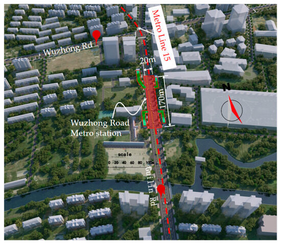 Location of metro station project in Shanghai, China. (Created by the author through aerial photography and modeling). The red dashed line indicates Shanghai Metro Line 15; red boxes indicate metro stations, and green boxes indicate exits.