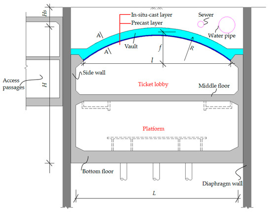 The vault of the Wuzhong Road Metro Station on Line 15 in Shanghai, China, is a composite structure consisting of precast and cast in situ layers. As shown in Figure 1, the station is located near the intersection of Guilin Road and Wuzhong Road, with its north side adjacent to Wuzhong Road. The station measures 170 m in length and 20 m in width, and is designed as a two-story column-free structure. The vault comprises two layers—the precast layer and the cast in situ layer—as illustrated in Figure 2. This study focuses primarily on the structural analysis of the vault.