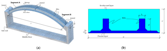 The prefabricated structure consists of two segments, as shown in Figure 3a. Segments A and B are upper double-ribbed sections (Figure 3b), which enhance the bending stiffness of the precast layer and increase the contact area with the cast in situ concrete [24]. The total longitudinal length of the precast arch segments is 93.6 m. The composite arch is assembled from 62 components, with each component having a width of w = 2.95 m. This dimension meets the requirements for standardized precast components, facilitating transportation and assembly, and conforms to the transportation and installation requirements of precast components, which helps improve construction efficiency and reduce project costs. The thicknesses of the precast arch segments (tp) and the integral arch (ti) are 0.1 m and 1 m, respectively. The rib height (hr) and width (br) of the precast segments are 0.5 m and 0.25 m, respectively [10]. Stirrups at the ribs and partially embedded truss rebars in the prefabricated structure improve the superposition effect with the cast in situ concrete [25,26].