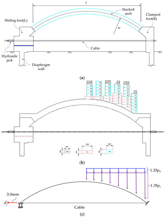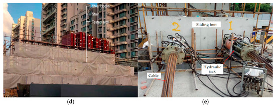 The experimental set-up consisted of the stacked arch, clamped foot, sliding foot, cables, hydraulic jack, stairs, and steel blocks, as illustrated in Figure 4a,d. Three different specifications of steel blocks were used to simulate vertical ground pressure. Their dimensions and weights are as follows: Specification 1: Dimensions of 2.84 m × 1.0 m × 0.56 m, weight of 10 t, with a total of 26 blocks used; Specification 2: Dimensions of 2.5 m × 1.6 m × 0.46 m, weight of 10 t, with a total of 12 blocks used; and Specification 3: Dimensions of 0.9 m × 0.9 m × 0.516 m, weight of 2.8 t, with a total of 8 blocks used. The arrangement of these steel blocks is shown in Figure 4c. As shown in Figure 4e, the tension of the cable was adjusted by controlling the load applied through a hydraulic jack at one end of the sliding foot, thereby modifying the boundary constraint of the arch foot.